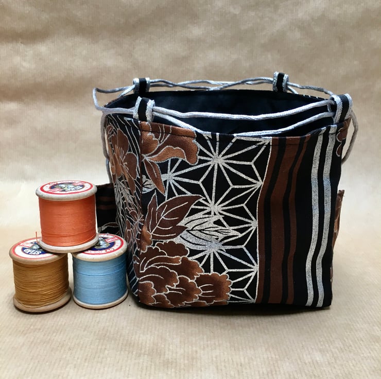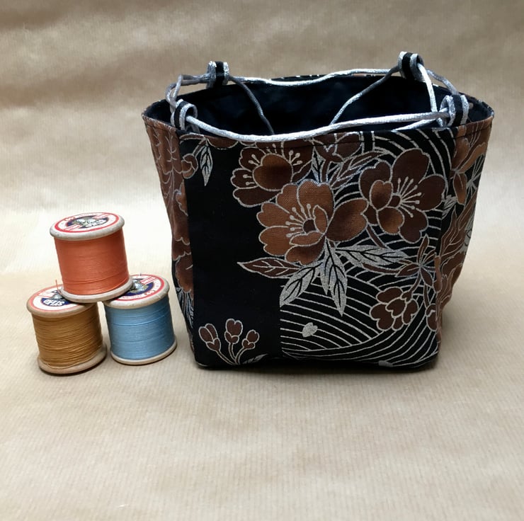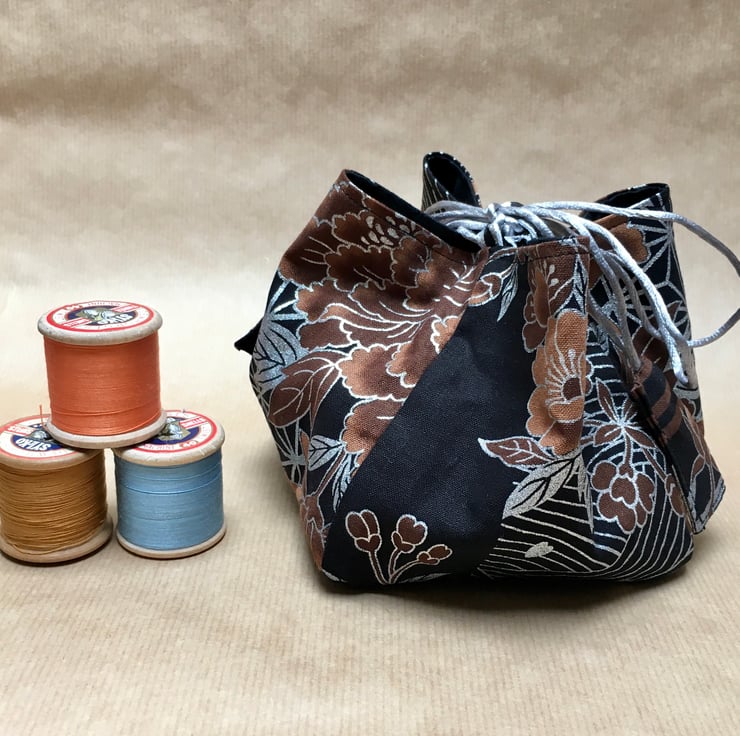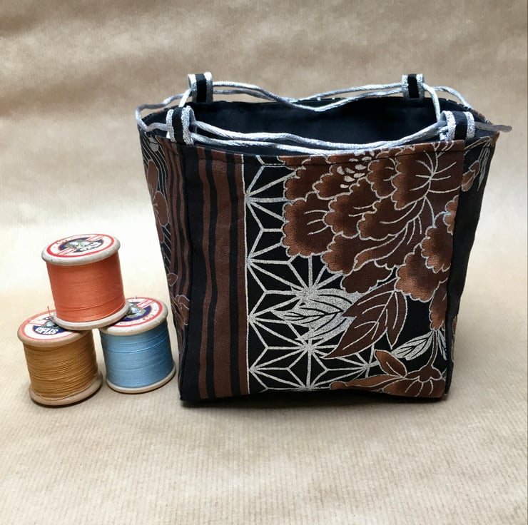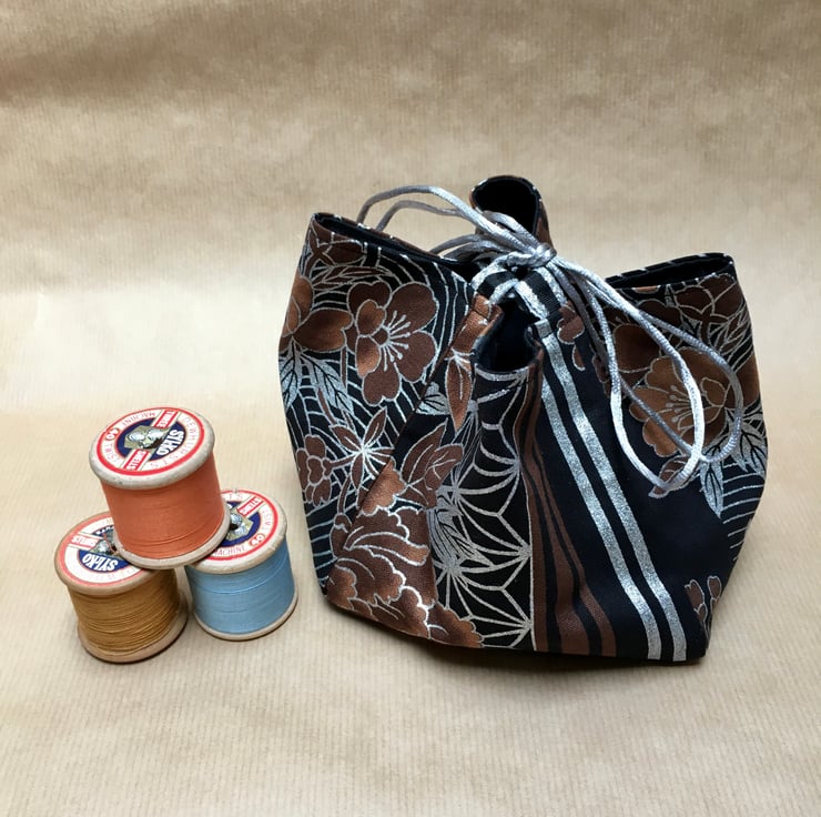 A striking silver gilded Japanese cotton fabric has been used to create this Japanese rice bag, with shades of brown, silver and black flowers, hemp leaves and stripes. The base is plain black cotton fabric.