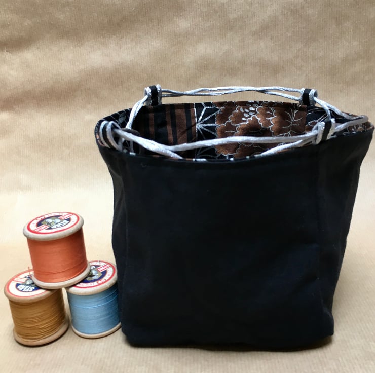 The bag is reversible with a black cotton fabric that helps show off the gorgeous fabric.