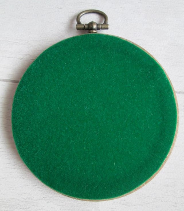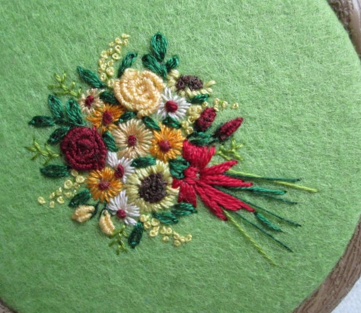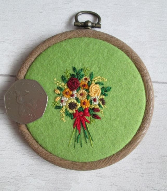 With the leaves turning on the trees, I decided it was about time I tried my hand at an autumnal bouquet embroidery. Worked in single and double strand embroidery thread on a beautiful green wool felt background, this little, one of a kind, bouquet measures just 5 cm tall by 3.5 cm wide. A rich selection of sunflowers, roses, rosebuds, gerberas and goldenrod are set off with green foliage and finished with a scarlet bow.