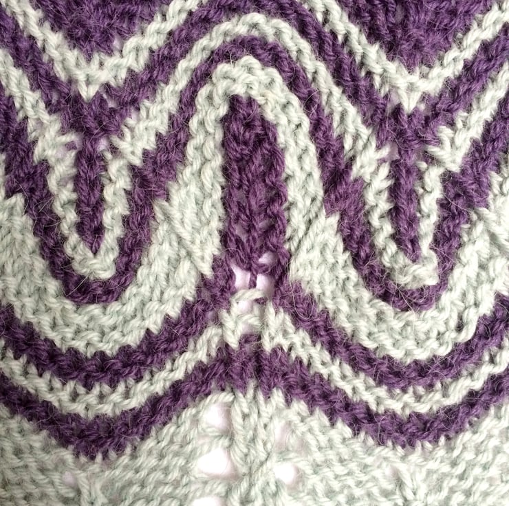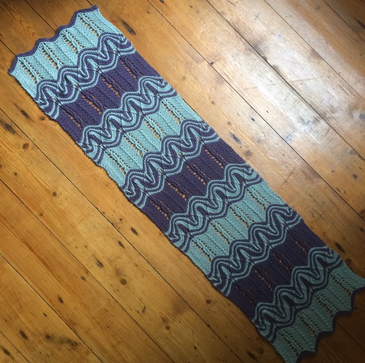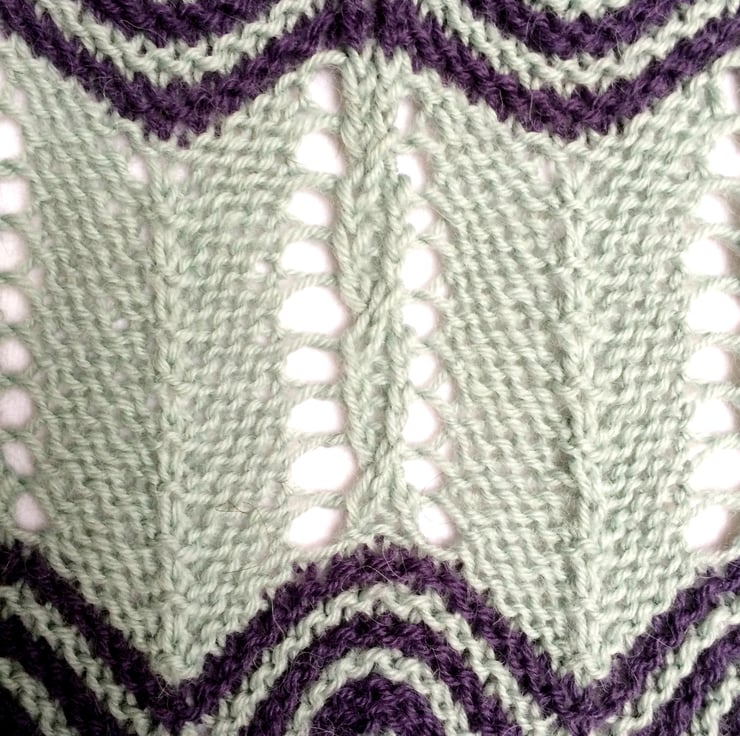 Simply stunning 2 coloured lace wrap. The natural curvy wave of the lace combined with the extreme increases and decreases of the stacked stitches (an unusual yet easy technique) in contrasting colours produces a dramatic effect.