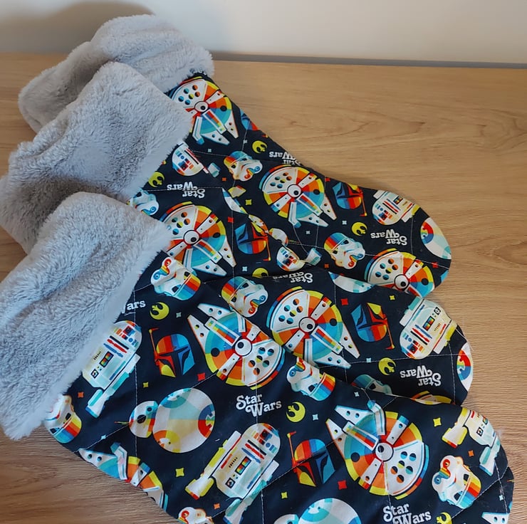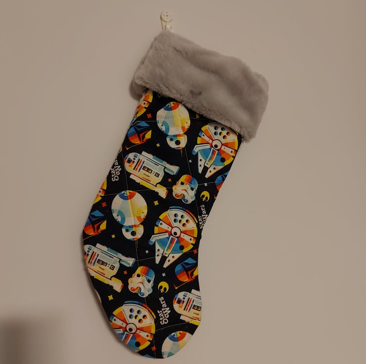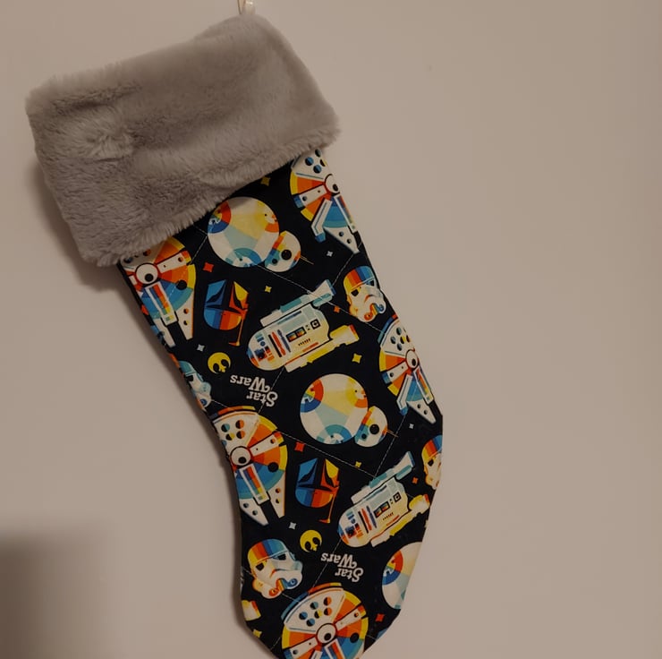 These are hand made Star Wars christmas stockings have a black background with repeating R2D2 , stormtrouper , BB8 and millennium falcon that have beautiful rainbow color fade over the top they are lightly quilted to add some texture and to hide whatever santa has left behind also like the clasic christmas stocking theses have a fake fur top in light grey they all have a off white gross grane ribon loop for haning