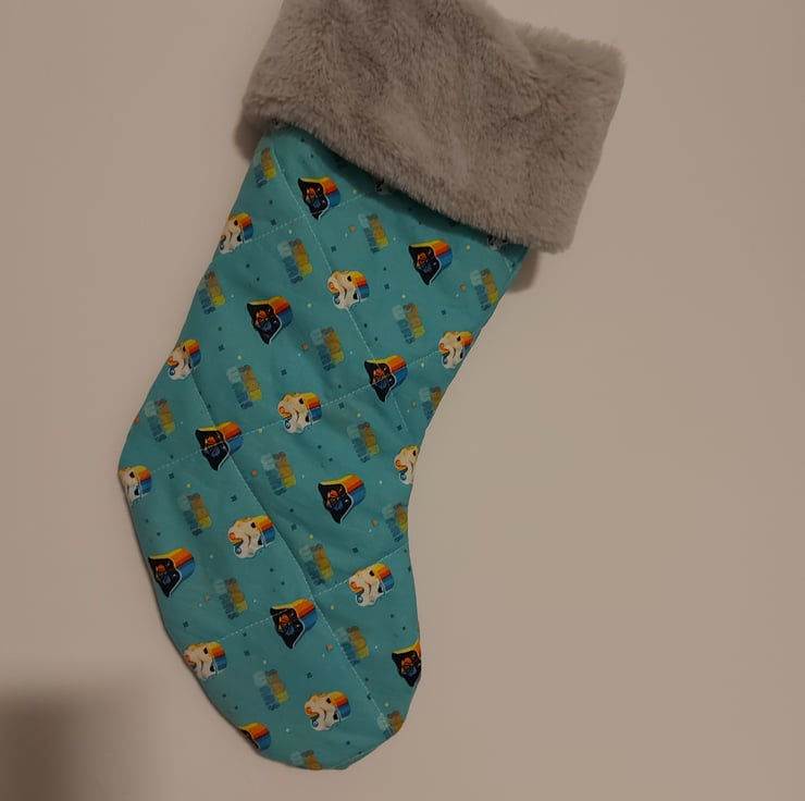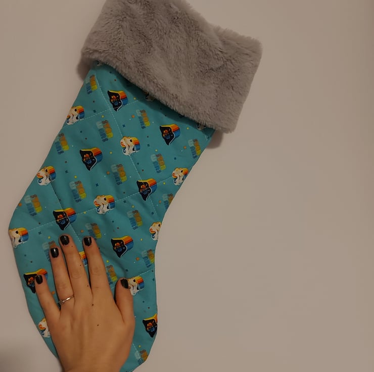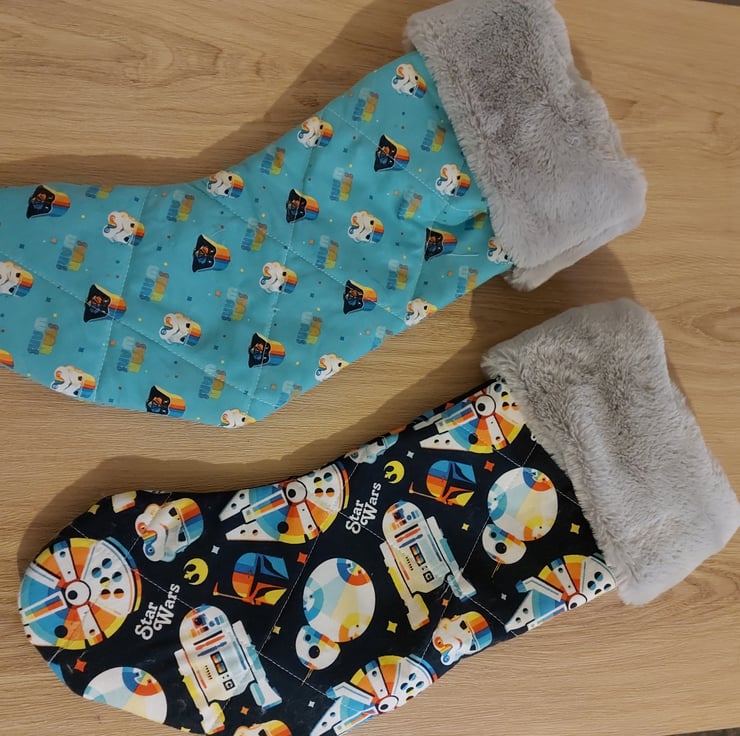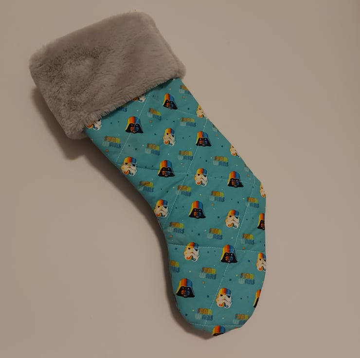 These are hand made Star Wars christmas stockings have a aqua blue background with darth vaders and stormtrouper helmits that have beautiful rainbow color fade over the top they are lightly quilted to add some texture and to hide whatever santa has left behind also like the clasic christmas stocking theses have a fake fur top in light grey they all have a off white gross grane ribon loop for haning