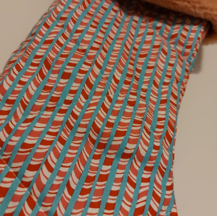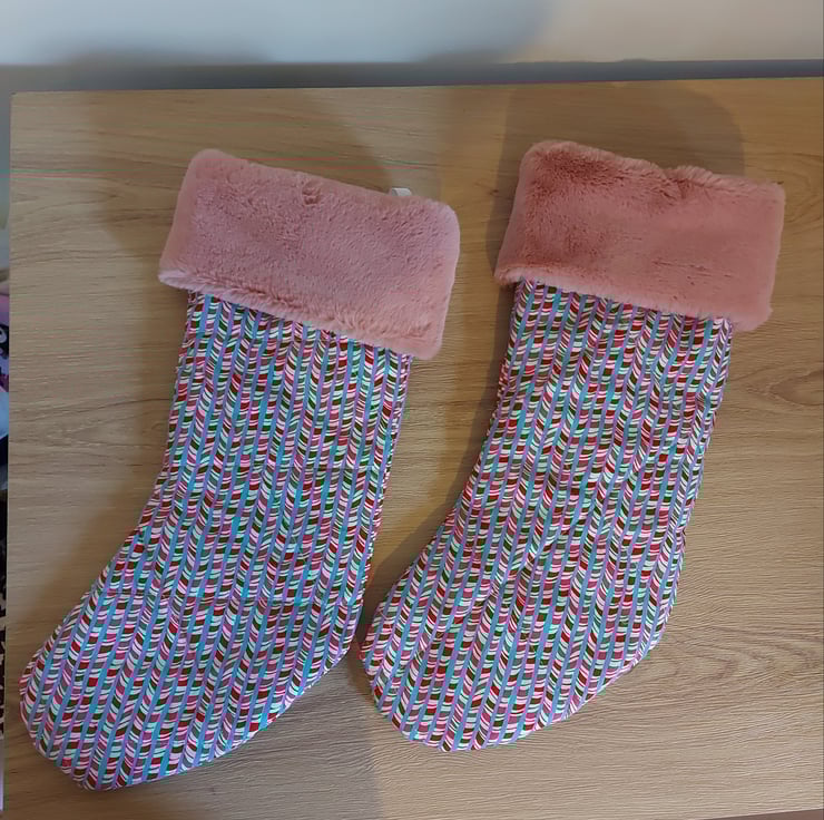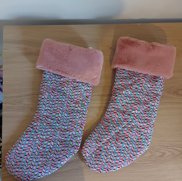 These are hand made candy cane print christmas stockings they are lightly quilted to add some texture and to hide whatever santa has left behind also like the clasic christmas stocking theses have a fake fur top in pink they all have a off white gross grane ribon loop for haning