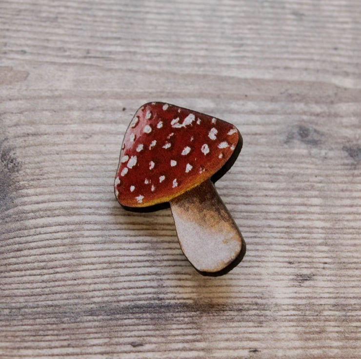 The mushroom now has a gloss coating to enhance its beauty and is plain wood on the reverse. A brooch bar pin is attached to the back of it so that you can pin it to wherever you like.