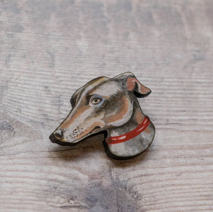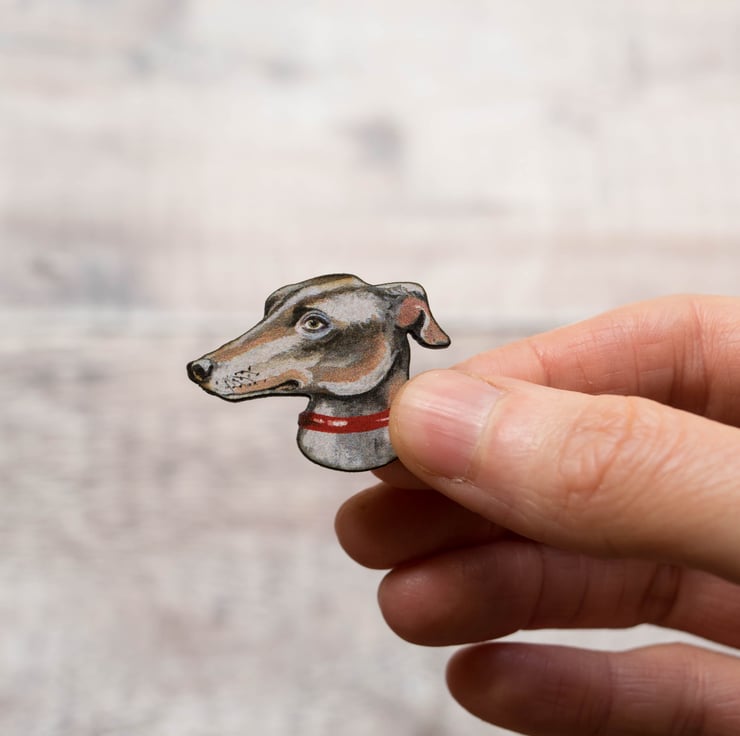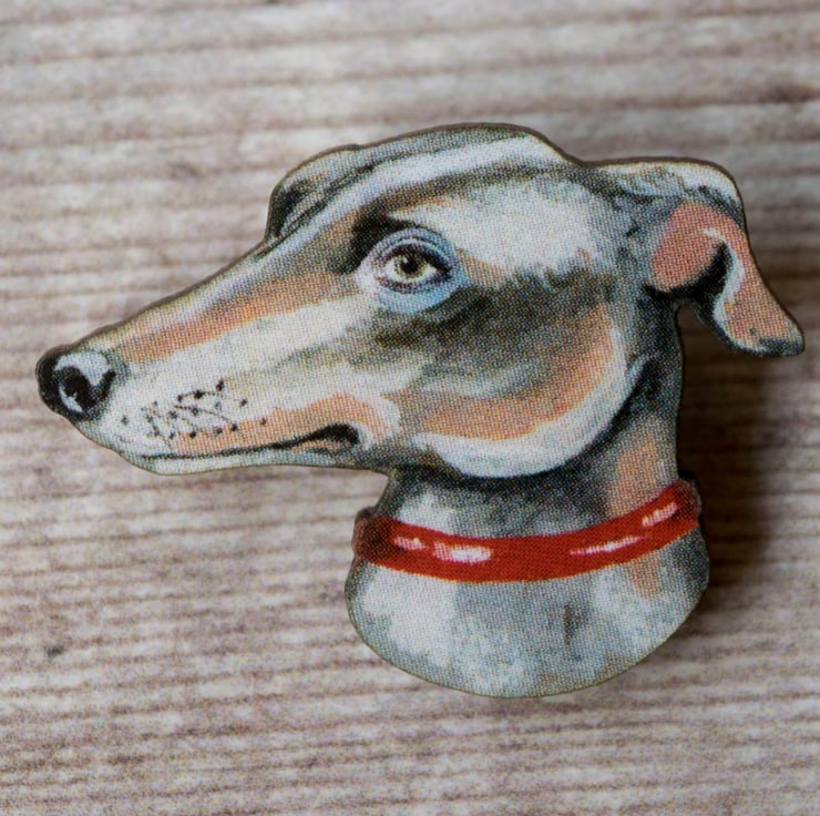 A little greyhound/ lurcher/ whippet dog head brooch ready and waiting to be attached to your clothing attire for all to admire!