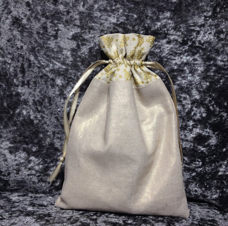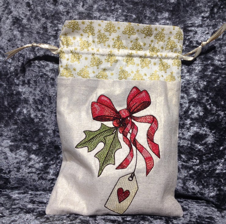 A beautiful holly and ribbon design with tag detail stitched onto gold effect linen fabir, topped with cream and gold tree print cotton fabric, lined with a dainty cream on cream floral print. Cream satin ribbon with gold lurex edging drawstrings complete the look. Can be recycled each year, easier than wrapping, just pop the gift in the bag draw the ribbons and add a tag.