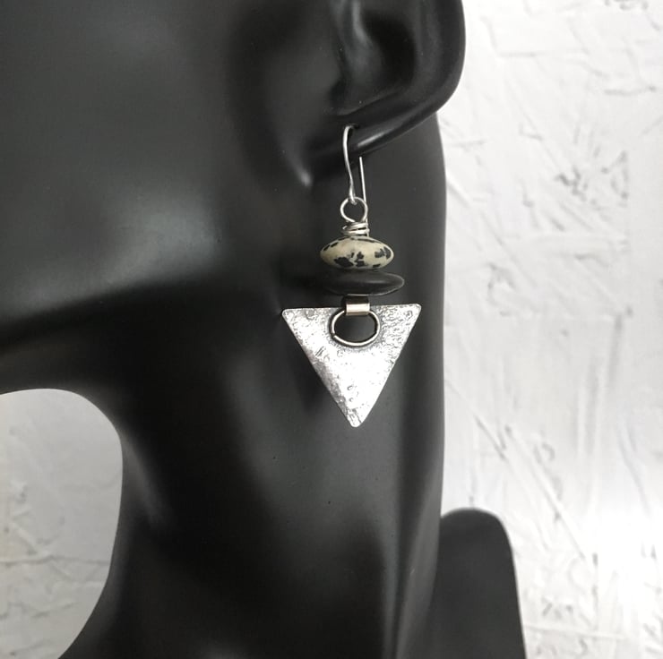 Textured triangles of silver have been topped with cream and black spotty beads. The beads are hinged, so the triangles swing.