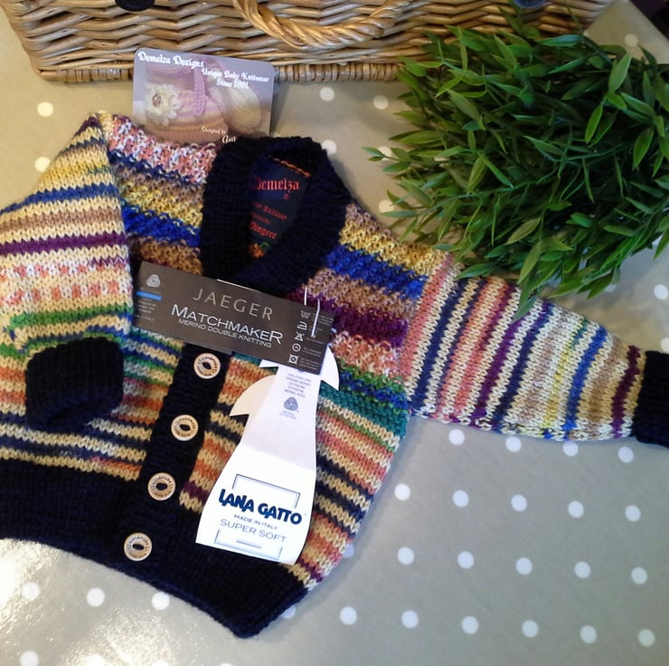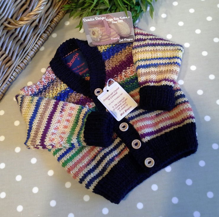 Baby knitwear is designed and hand crafted by Demelza Designs in Cornwall meeting UK baby safety standards, Only branded premuim acylic, acrylic/natural fibre blends or pure natural fibre yarns are used in baby knitwear which conforms to BS984/76 standards.