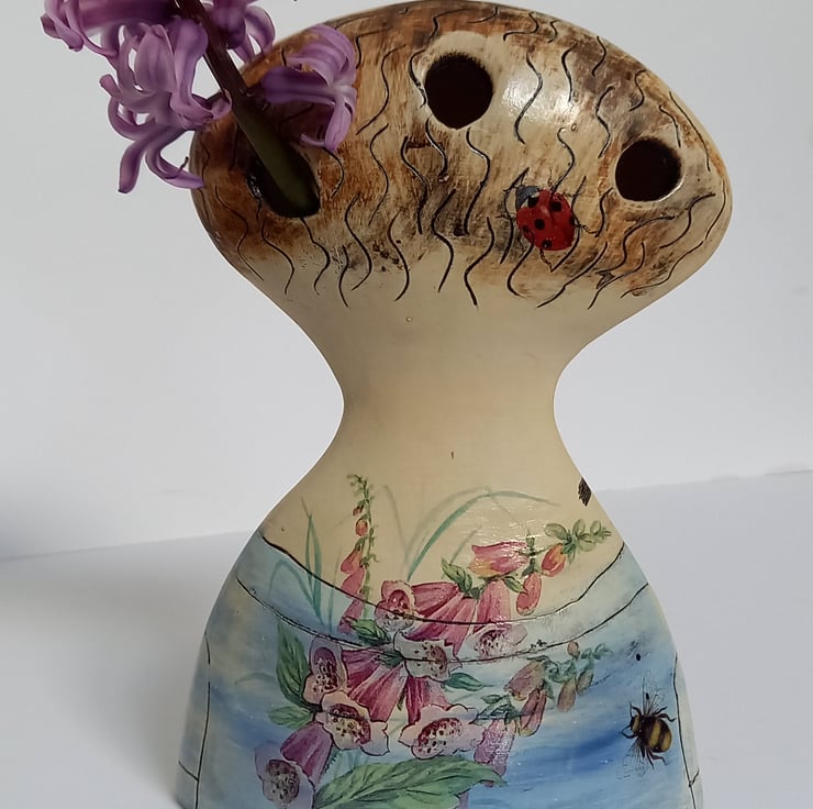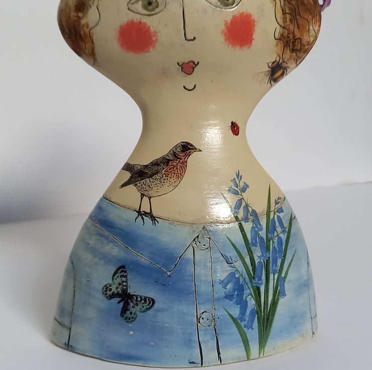 Hand made and decorated with coloured slips and glazed in a transparent glaze. Ceramic decals of flowers birds and insects and added to give detail. Openings at the back of her head allow for dried flowers or grasses. Will be carefully packed and posted.