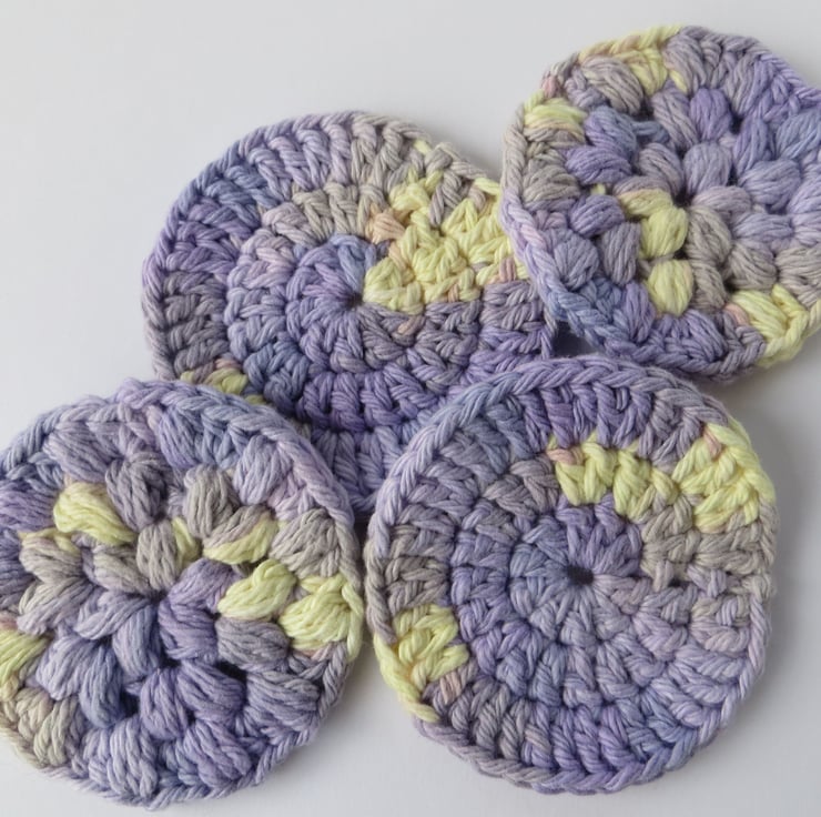 These versatile crocheted facial pads measure 7cm across and each set has 2 smooth and 2 textured pads.