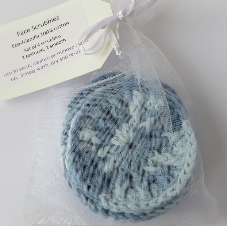 A set of 4 face scrubbies in an organza bag, that make a lovely small gift or a treat for yourself. Available in a choice of colours.