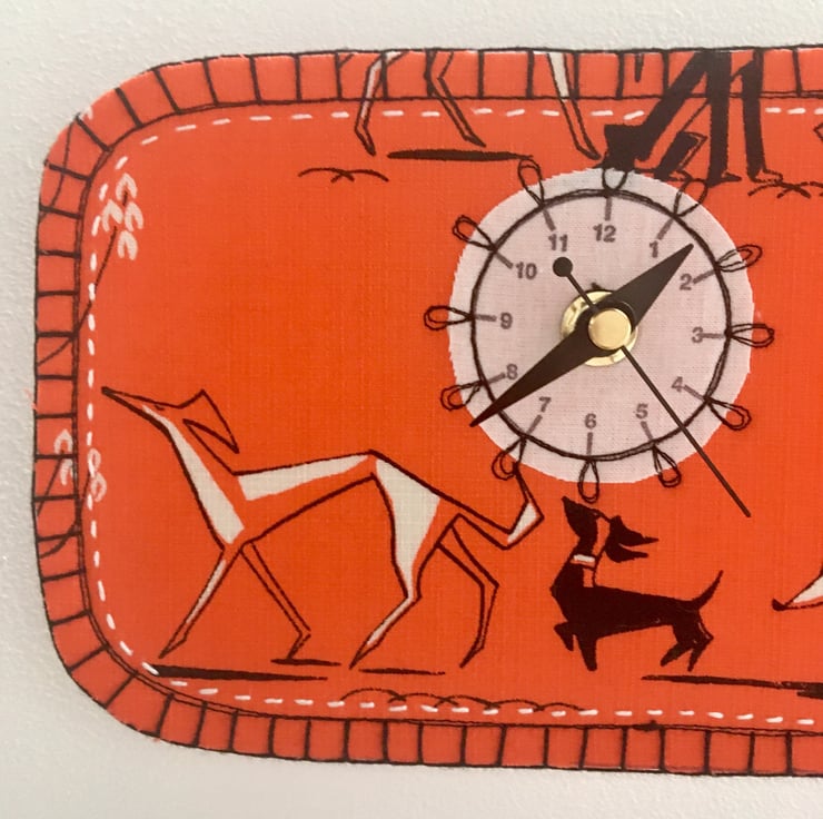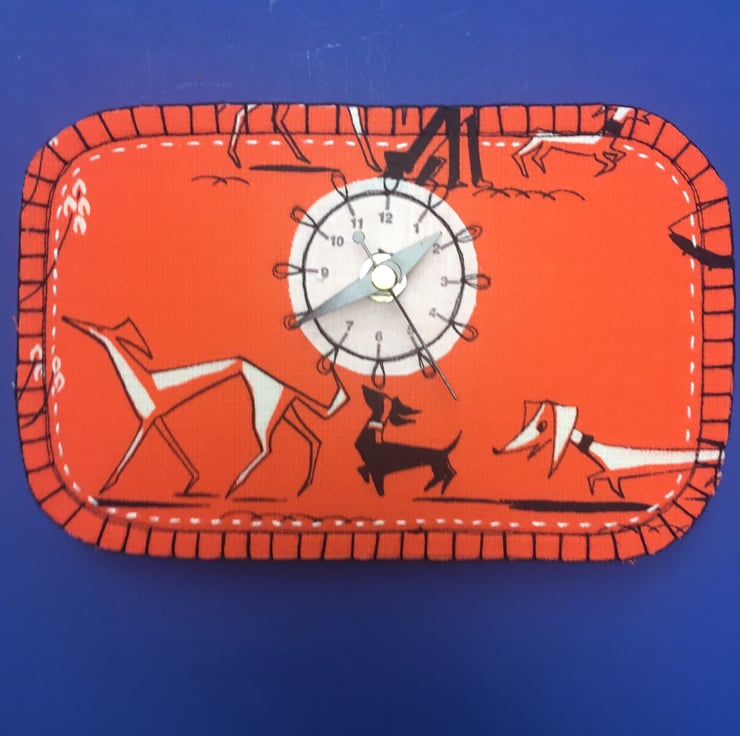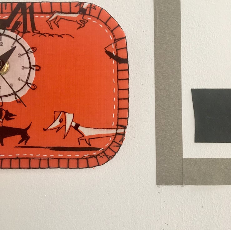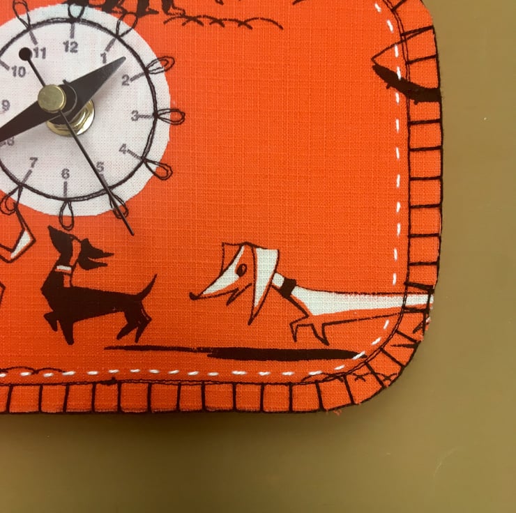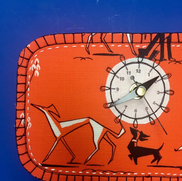 I’ve been making clocks from vintage fabrics for about a year, but they are usually abstract. This fabric shouted (woofed actually) at me to be clocks!