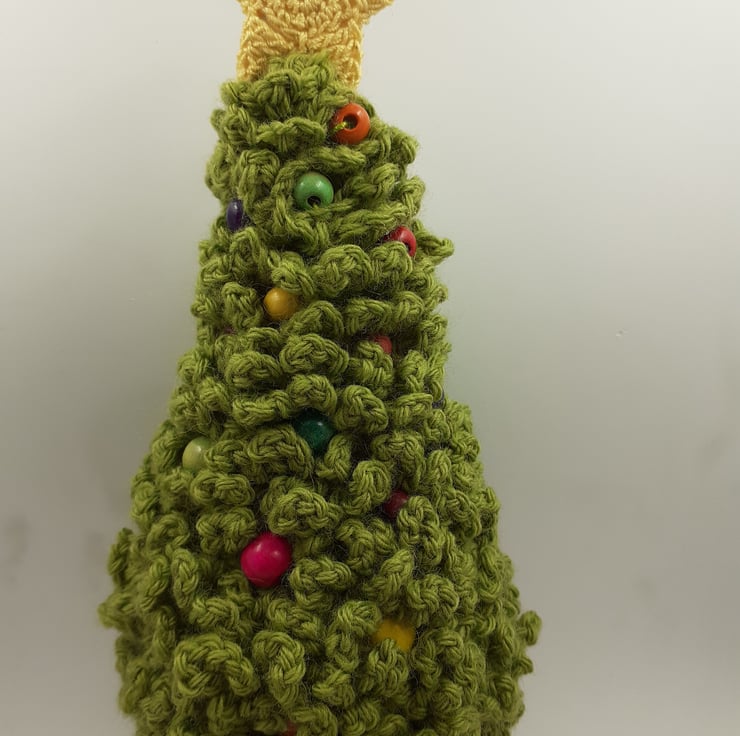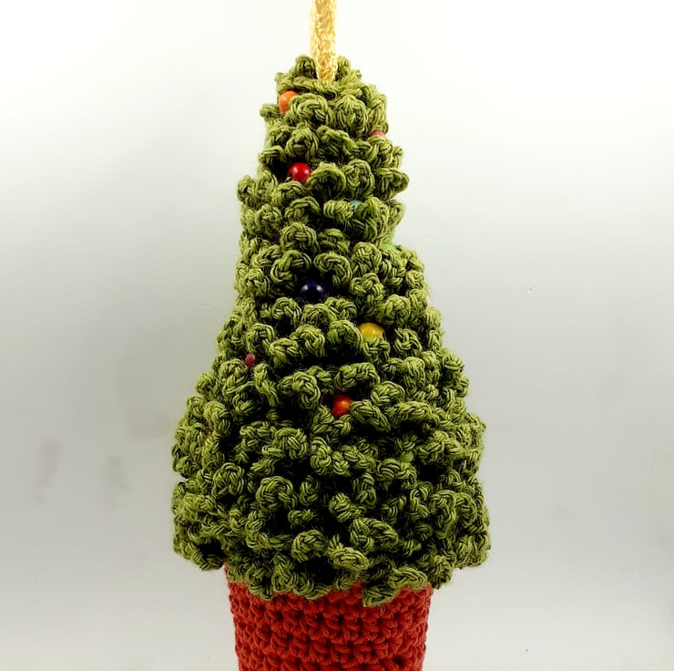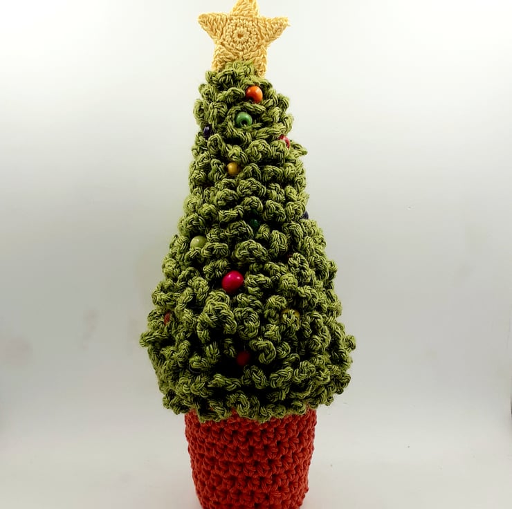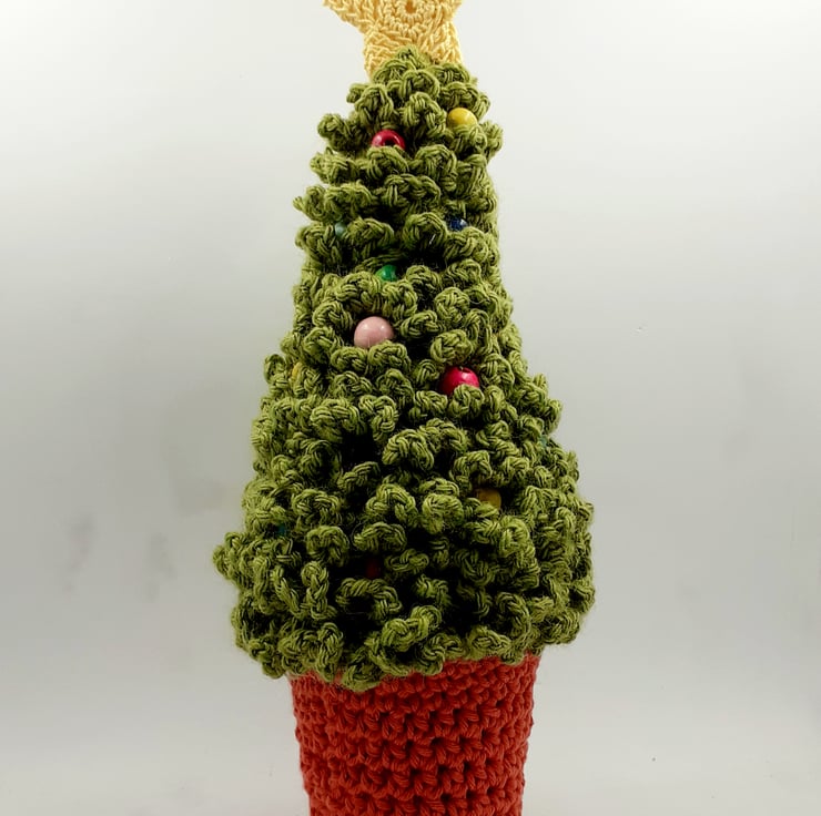 This festive tree is crocheted in a wool- rich yarn, filled with polyester stuffing and decorated with painted wooden beads which nestle between the branches. There is a crocheted cotton star on top and the tree stands in a pot which is also crocheted in cotton around a plastic pot ( from my stash, no more will be purchased.) The pot is weighted with a gauze bag containing rice. The tree measures approximately 24cm tall from the base of the pot to the top of the star.