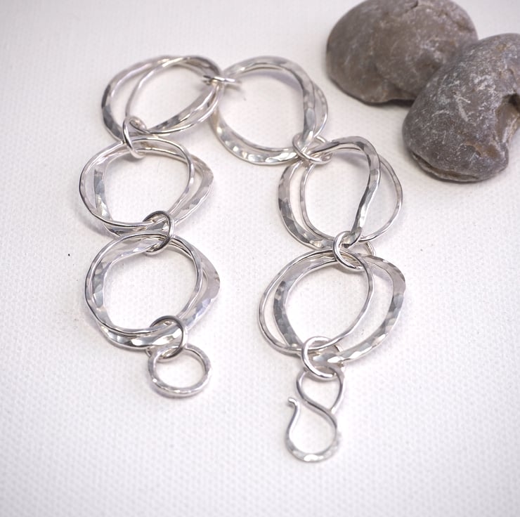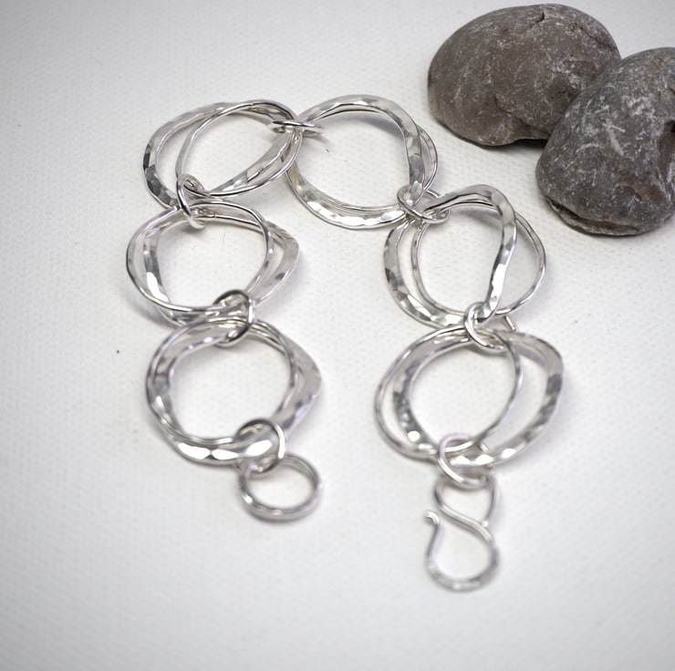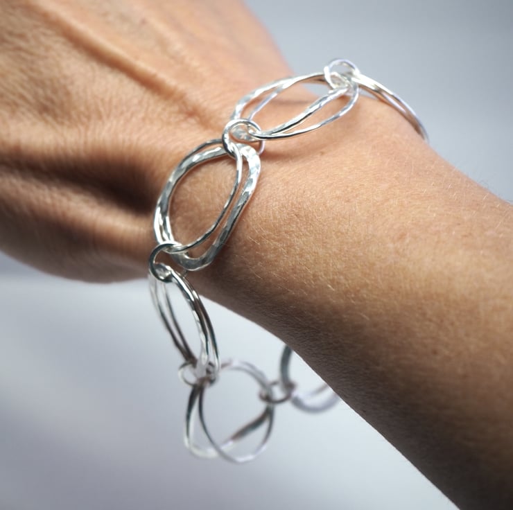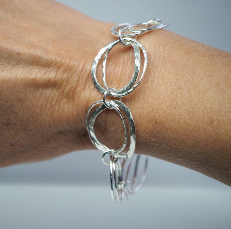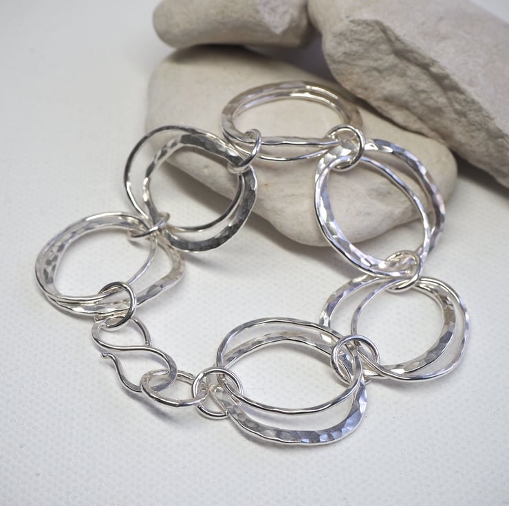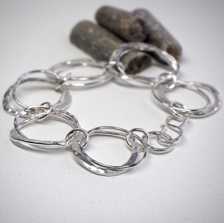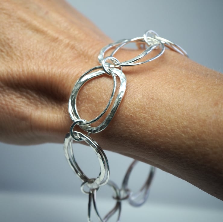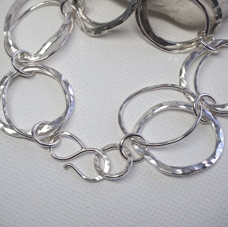 Each link has a thick misshapen hoop and a thinner, mostly oval shaped hoop. They have all been hammered on one side to give a lovely facetted texture and to add a bit of sparkle. The silver is polished to a bright shine to finish. This is a lovely modern piece of statement jewellery that really catches the eye.