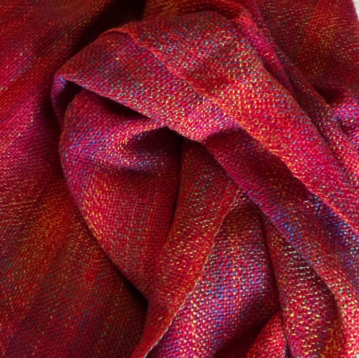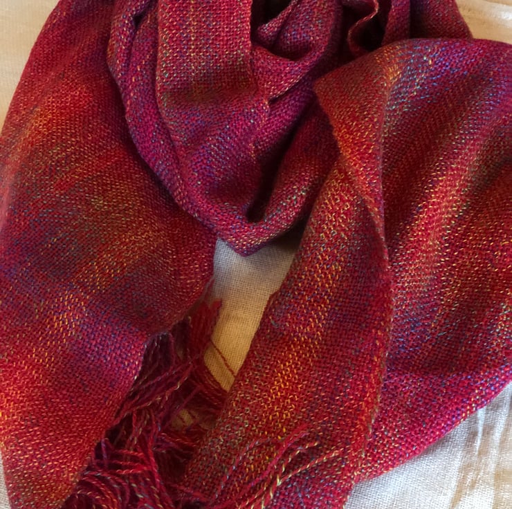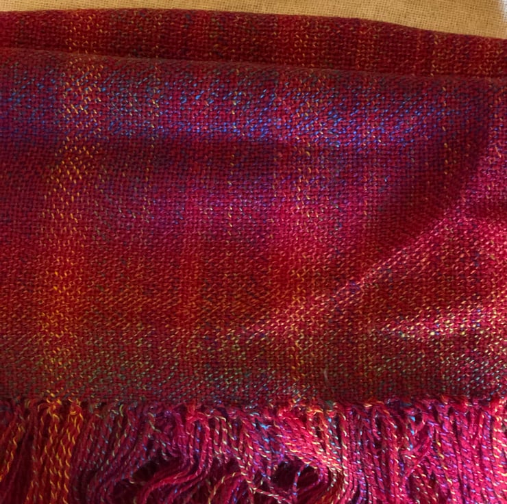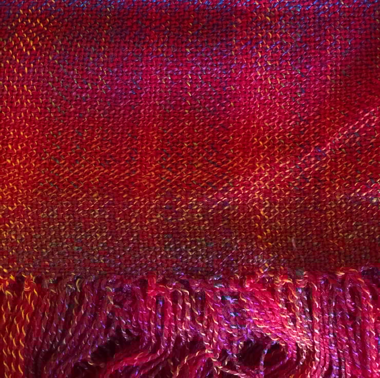 Handwoven Pashmina style scarf in a lovely rich red and multicolured acrylic yarn. I love this yarn and used it for both the warp and weft threads and it has given a subtle strip effect into the weave. I have included a photo of the yarn so that you can see the different colours