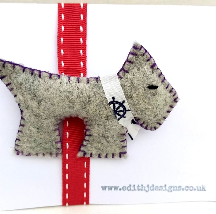 Felt dog brooch. Could be a Scottie or a Westie. He loves the seaside and is wearing his nautical collar. Edged with purple blanket stitch. Being sold as part of stock clearance in Seconds Sunday at a reduced price