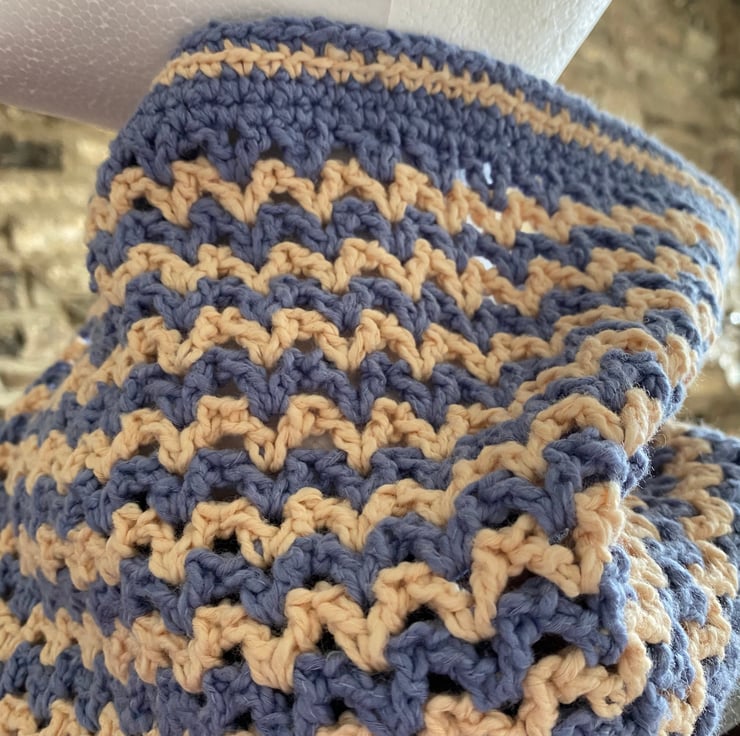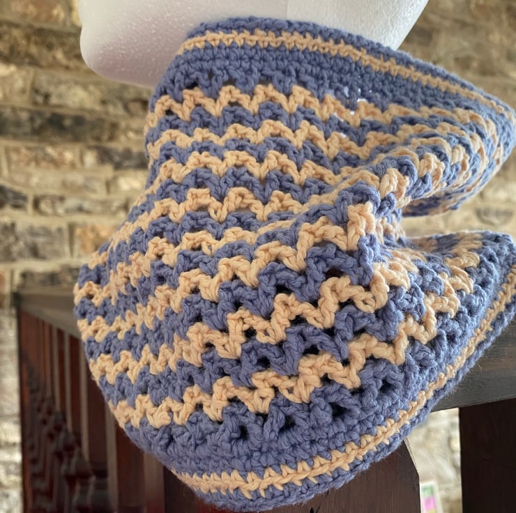 This lightweight cowl will keep you warm without being bulky. I’ve crocheted it in the airy ‘V stitch’ in a cotton blend yarn in blue and beige. The soft palette will suit many colours, and it’s a great addition to layering an outfit in changeable weather. This cowl is smooth and soft, with a lovely drape.