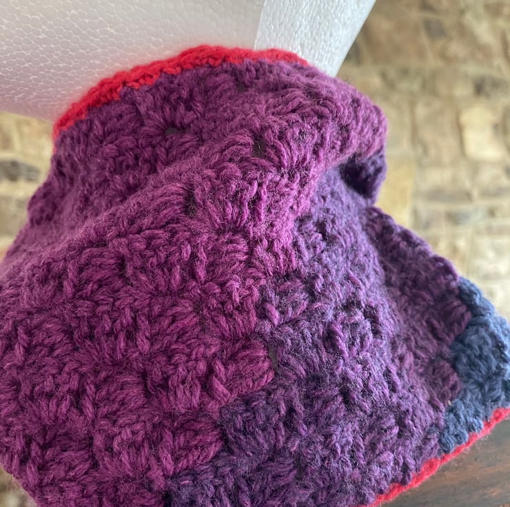 This lightweight cowl will keep you warm without being bulky. I’ve crocheted it in a premium acrylic yarn so it is soft with a gorgeous drape. I’ve used ‘corner to corner’ crochet and a type of yarn called a ‘yarn cake’ - these are large balls of yarn which change colour abruptly rather than a gradual fade. This cowl starts in navy, then changes to purple, a dark pink, then a brighter pink which I’ve continued along both edges.