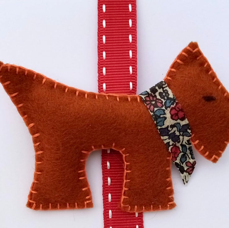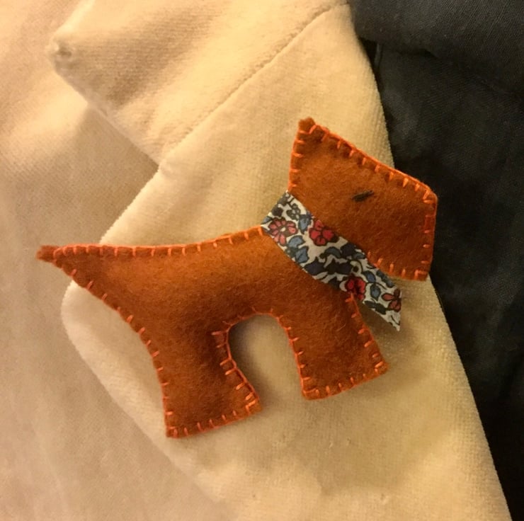 Little brown terrier brooch, made with felt, wearing a pretty Liberty collar. Being sold on Seconds Sunday at a reduced price as part of stock clearance