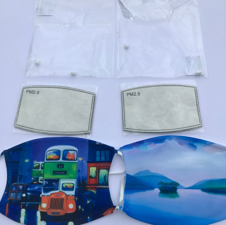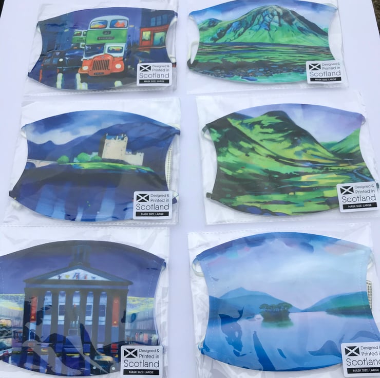 Facemasks featuring some images of artist James Dinnen’s popular Scottish artwork.