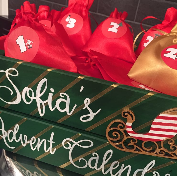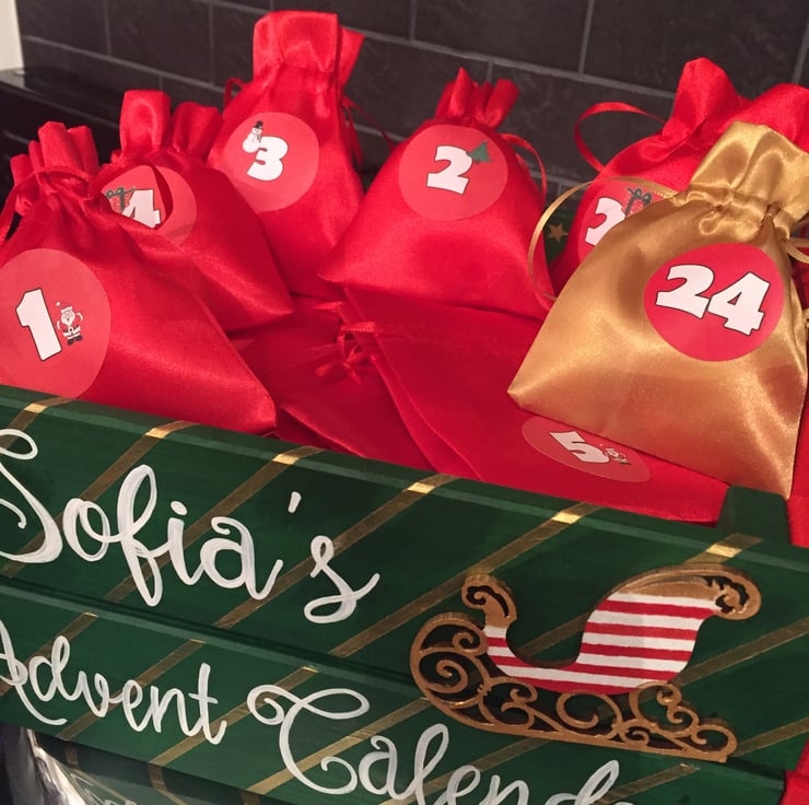 24 red Santa Sacks to fill one for each day throughout December, Number 24 is gold for that extra special surprise gift
