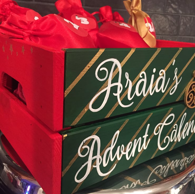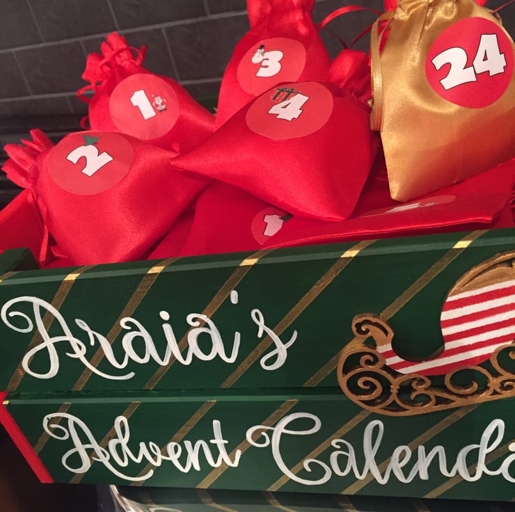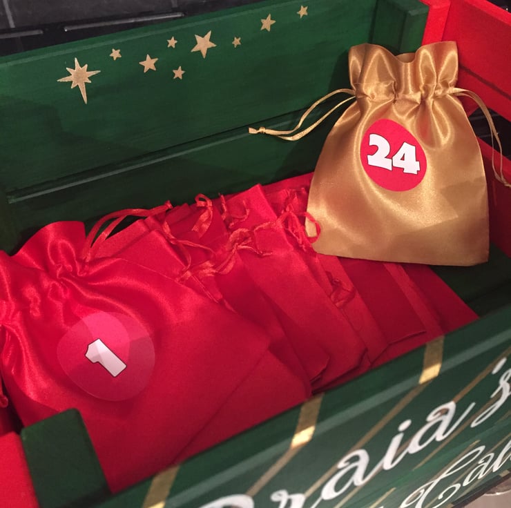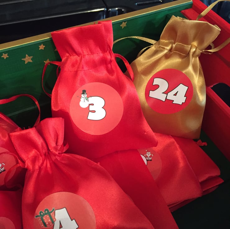 24 red Santa Sacks to fill one for each day throughout December, Number 24 is gold for that extra special surprise gift