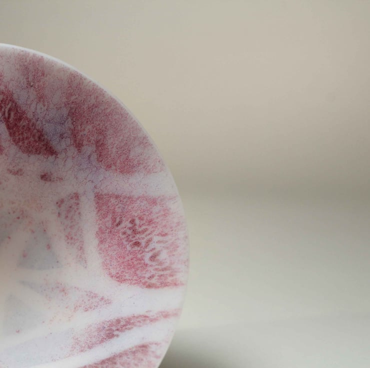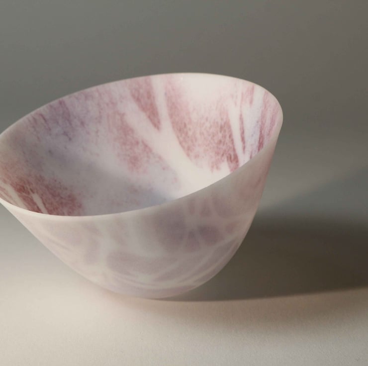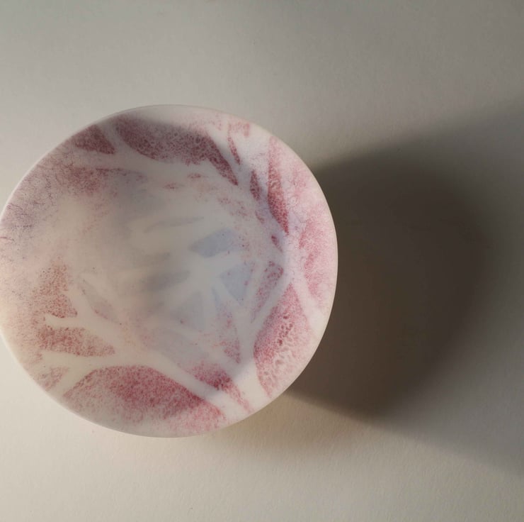 This little matt white glass bowl is made by using gravity in the kiln to form the shape. It has a subtle and delicate patterns on both sides in purples and pinks. It measures approx 90x70mm