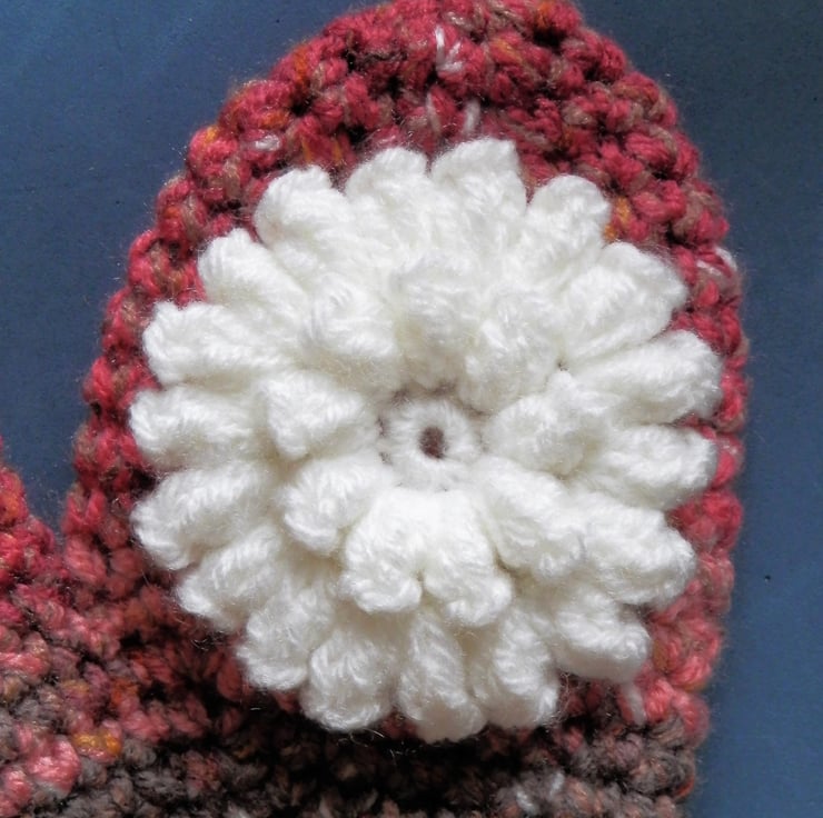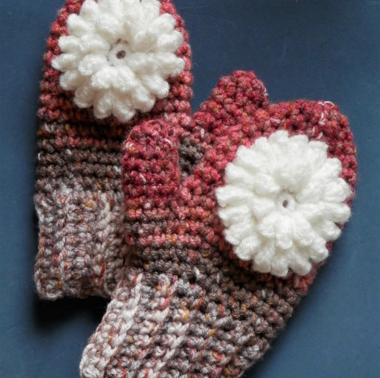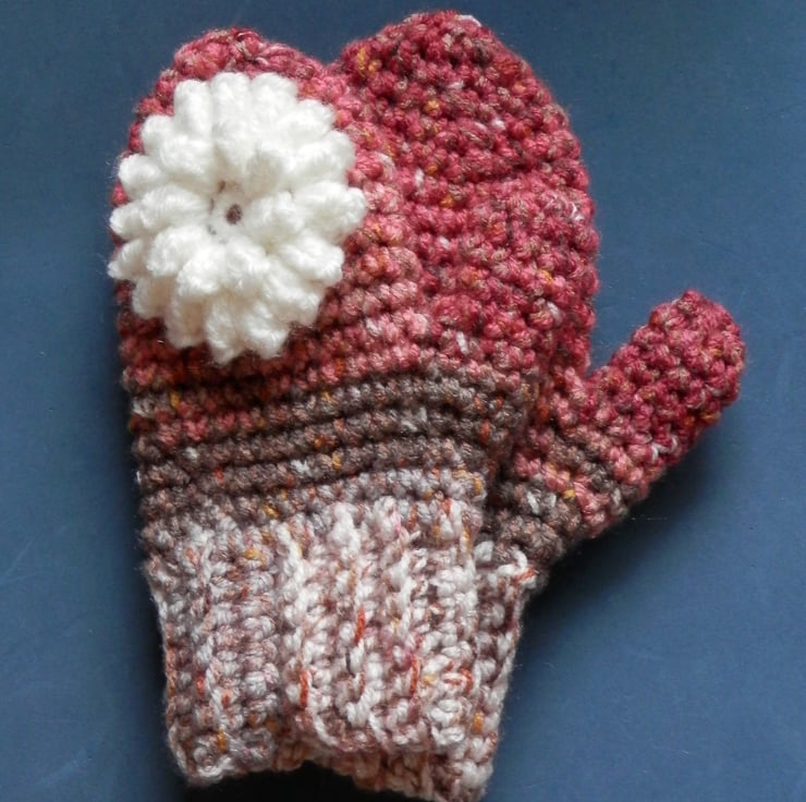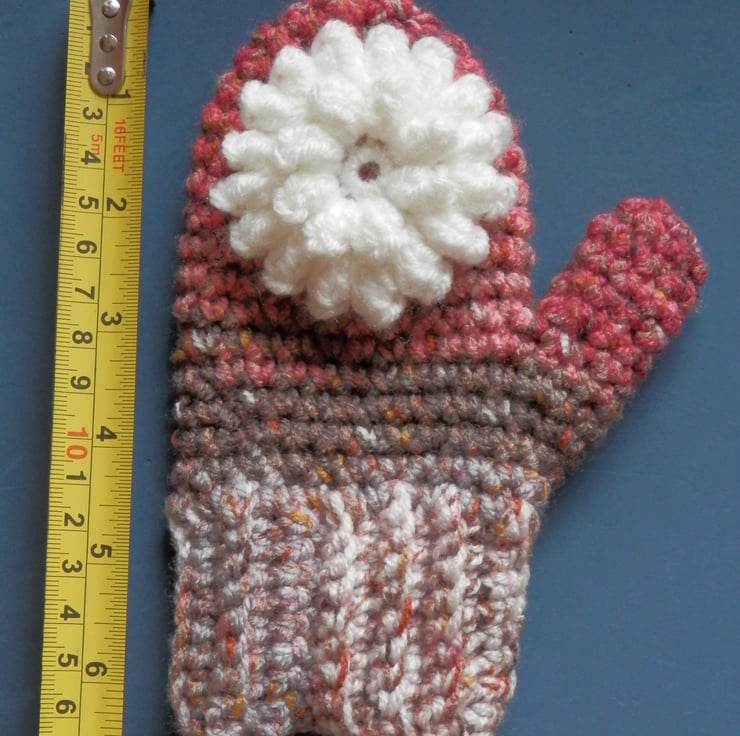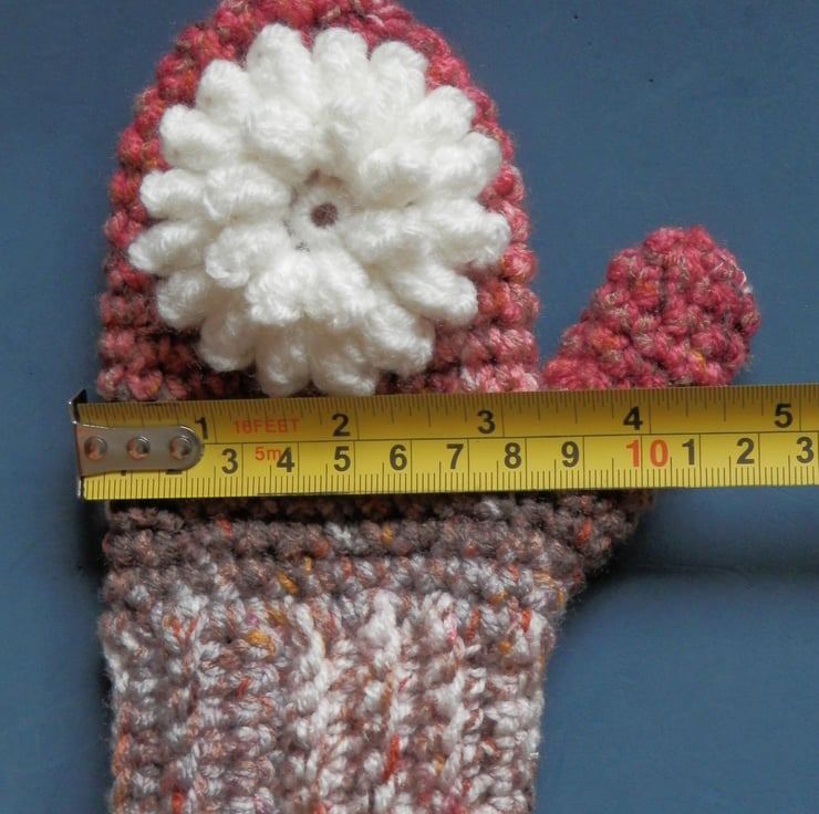 Crochet Mittens made from acrylic yarn with pretty tactile flower head sewn to the backs. All hand made by me in Wiltshire UK. Wash at 30 degrees. Please see photo showing measurements to check they will fit your child. Postage to the UK is included in the price shown.