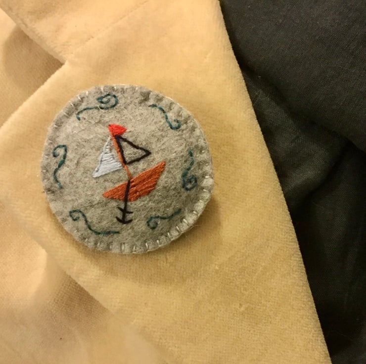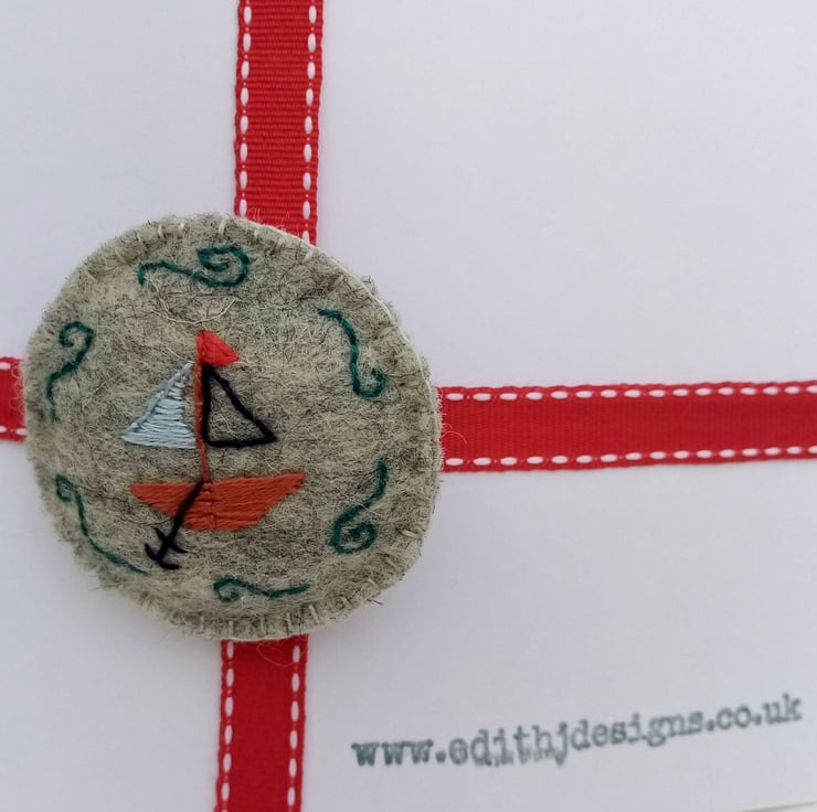 Hand embroidered brooch with a tiny boat, complete with grey sails and anchor. Great gift for anyone who loves the sea. Being sold on Seconds Sunday as part of stock clearance