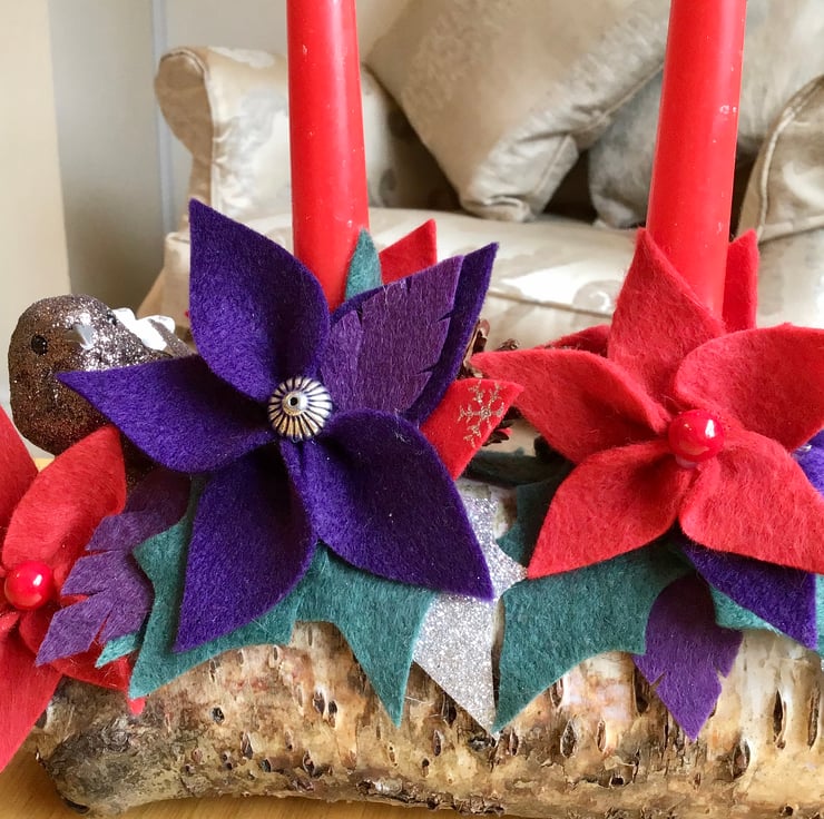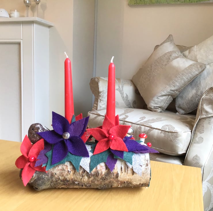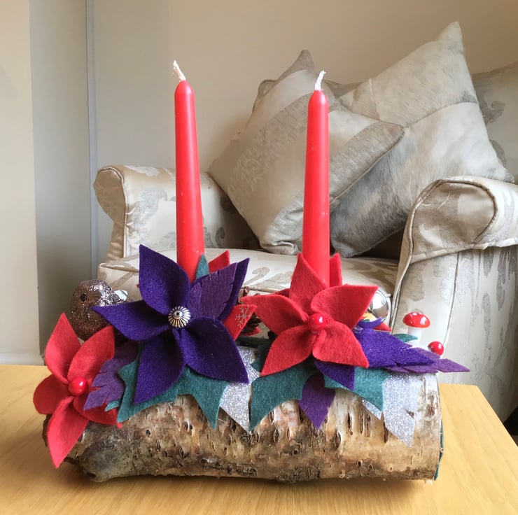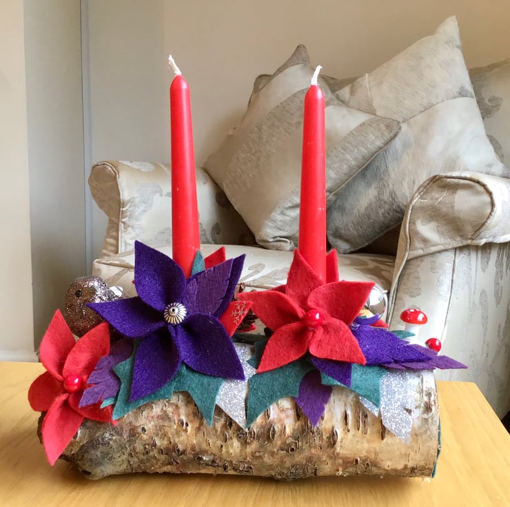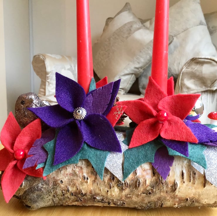 The candles are on a beautiful rustic silver birch log holder and decorated with (hand cut) felt holly, pine cones, artificial berries and other decorations. Everything on it is everlasting.