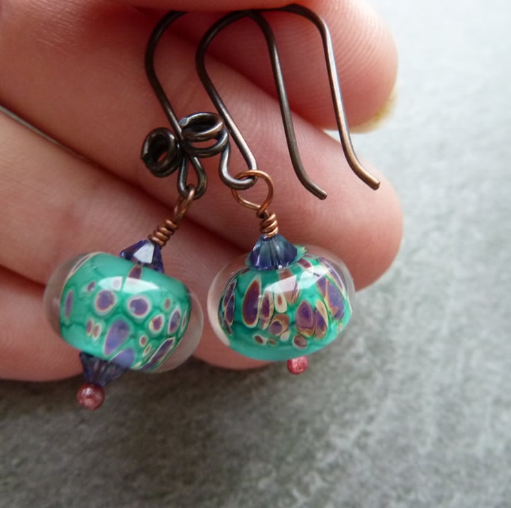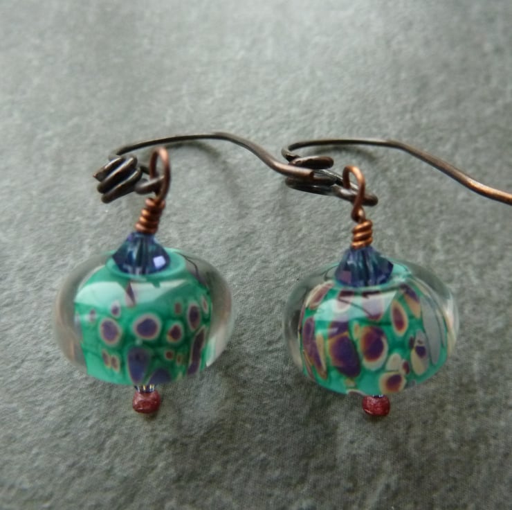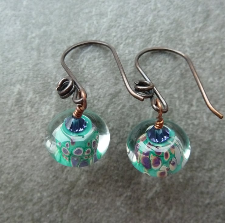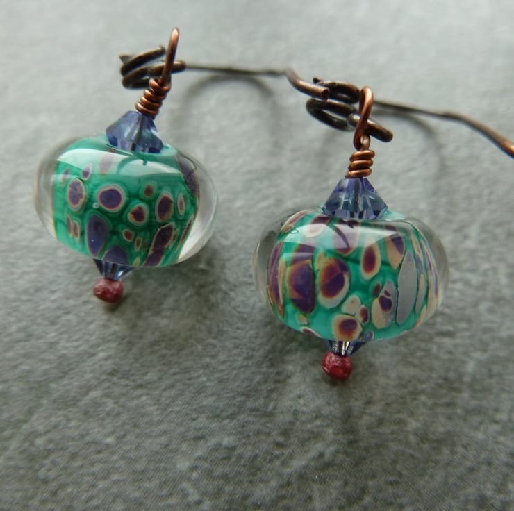 A pair of earrings made with handmade copper ear wires, purple glass crystals and handmade lampwork glass beads.