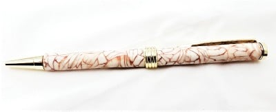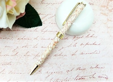 A good quality brass barrel twist style pen that has been covered in polymer clay. In making this item I conditioned the clay and mixed the colours for what I needed. I then proceeded into making the cane to achieve the faux stone affect.