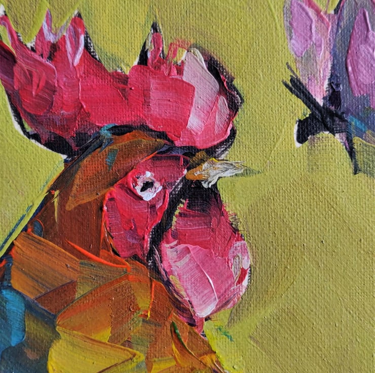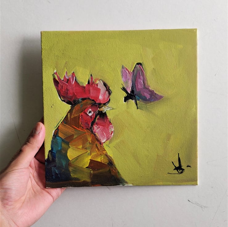 A quirky rooster and butterfly oil painting . A wonderful piece to have framed and hung in your home, an office or restaurant.