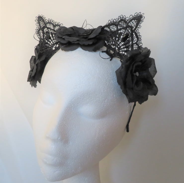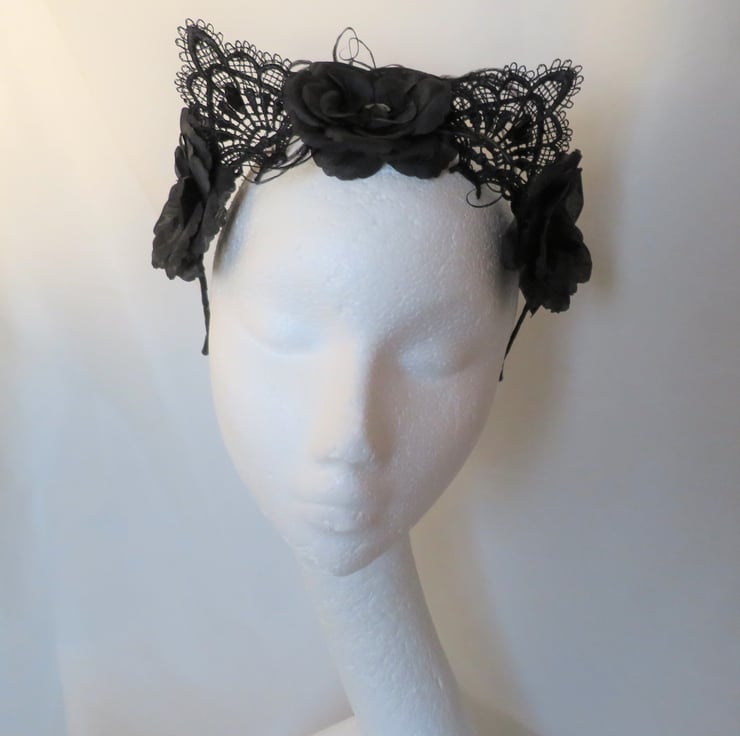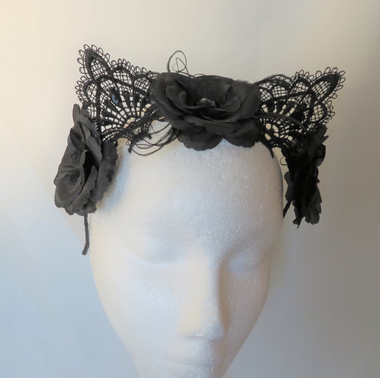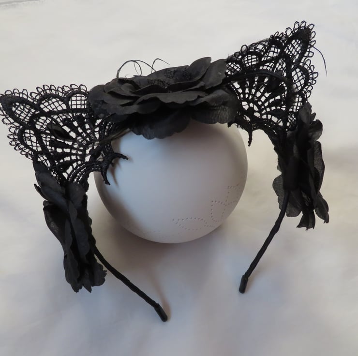 Made with a thin metal headband, bound with black satin ribbon (bought in, not made by me) with ears covered with a lace applique, handsewn onto the ear frame, with a oval shaped crystal on each.