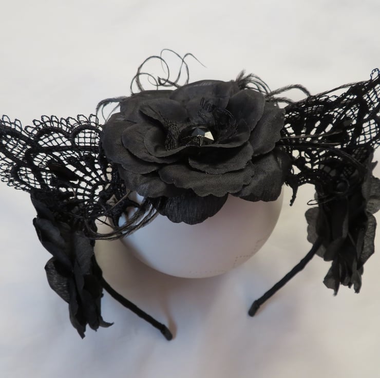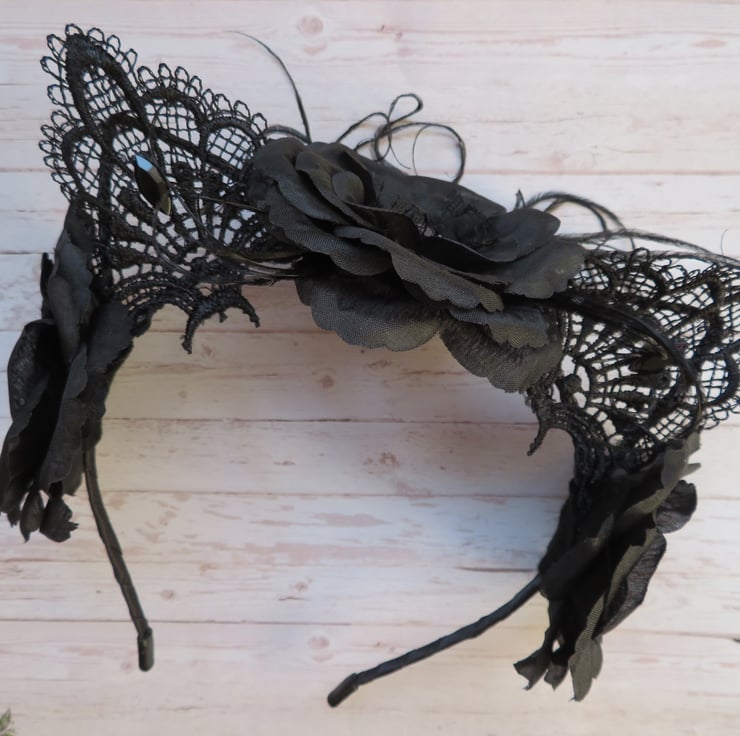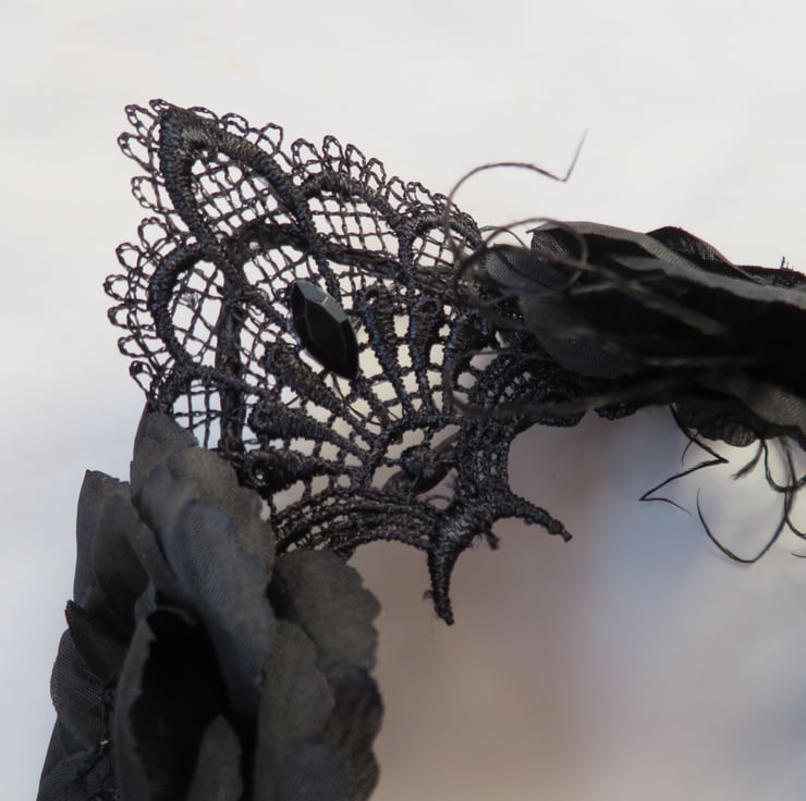 This is a simple and fabulous Gothic style artificial flower & lace crown in all black.