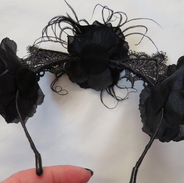Decorated with three small black fabric roses with lace & black crystal gems in the centres, the middle rose has extra floaty ostrich fronds too.