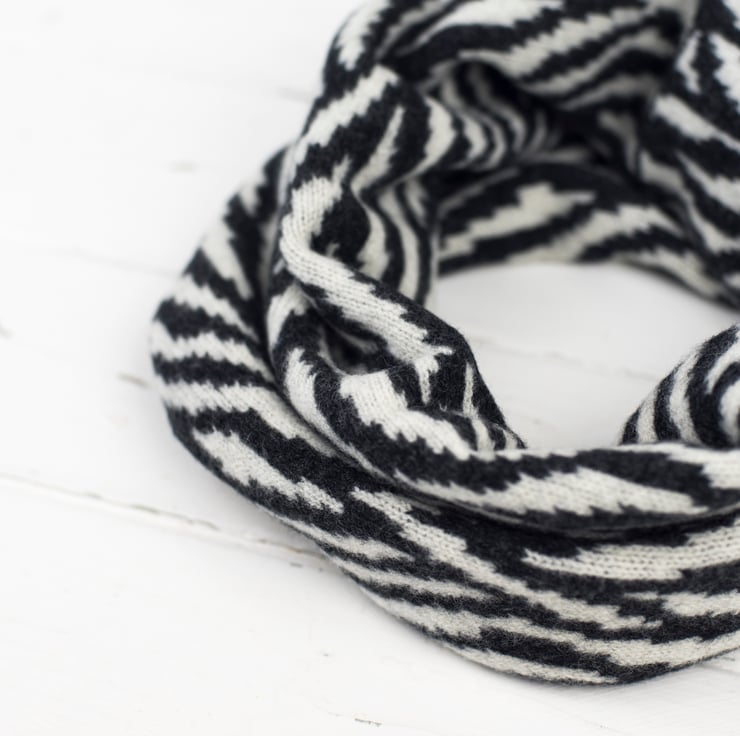 Brighten up your winter with this cosy cowl knitted in a geometric zebra pattern, the perfect size to wear alone over a jumper or with a winter coat.
