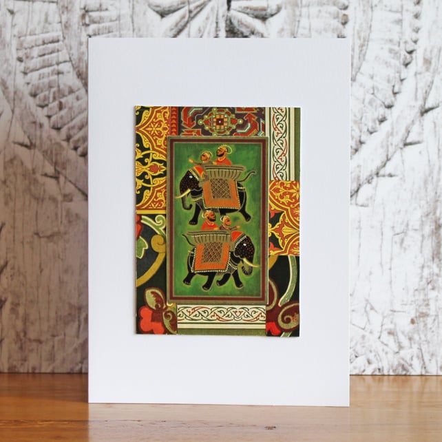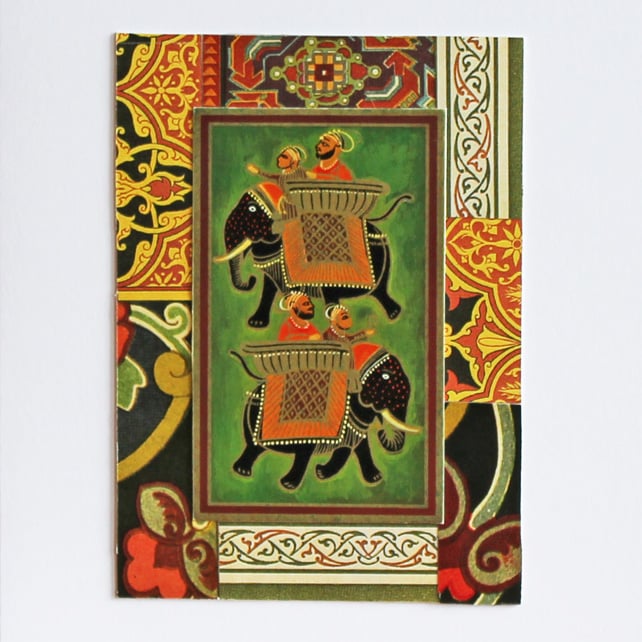 This small collage has a pretty vintage playing card in the centre. A selection of patterned papers from old books have been used to create a tapestry effect.