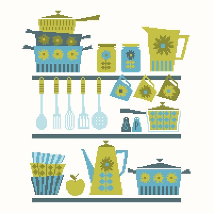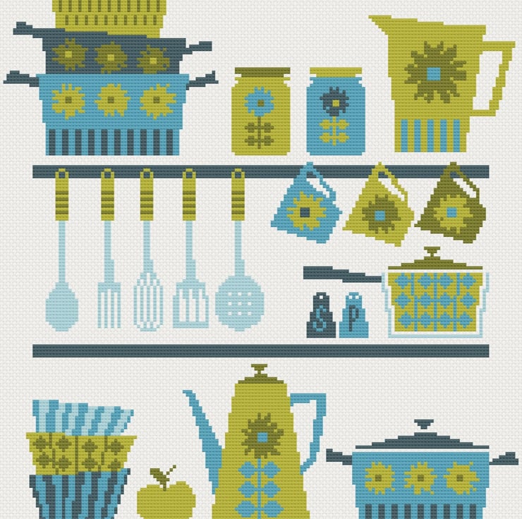 Cross stitch pattern 186C - Mid-Century retro 50's styled kitchen coffee pot, cups, pots and pans - Cool shades - quirky retro cross stitch/tapestry PDF chart by Vivsters. No delivery costs - PDF counted chart file straight to your inbox. Start stitching straight today!