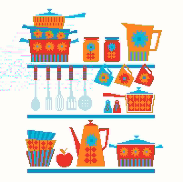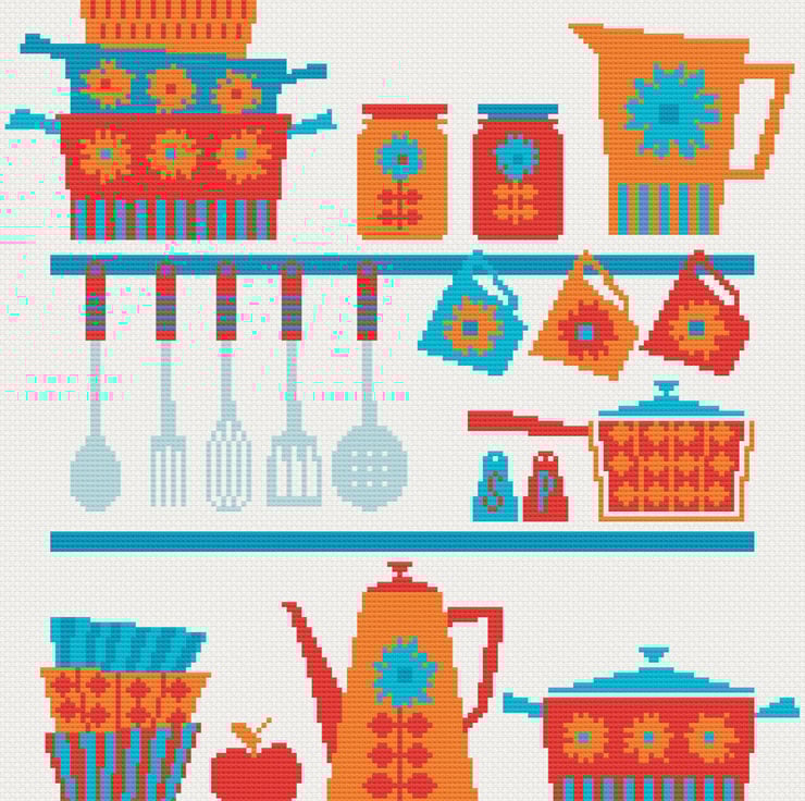 Cross stitch pattern 186B - Mid-Century retro 50's styled kitchen coffee pot, cups, pots and pans - Warm shades - quirky retro cross stitch/tapestry PDF chart by Vivsters. No delivery costs - PDF counted chart file straight to your inbox. Start stitching straight today!