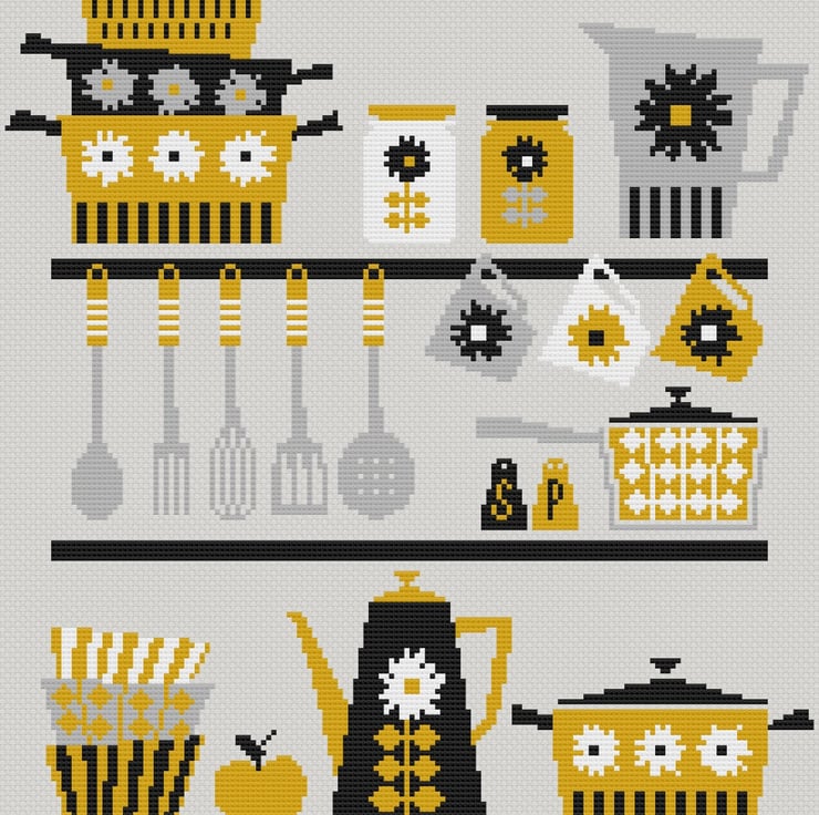 Pattern Keeper compatible - Mid Century retro 50's styled kitchen coffee pot, cups, pots and pans - Dark shades - modern/contemporary cross stitch/tapestry chart by Vivienne Powers