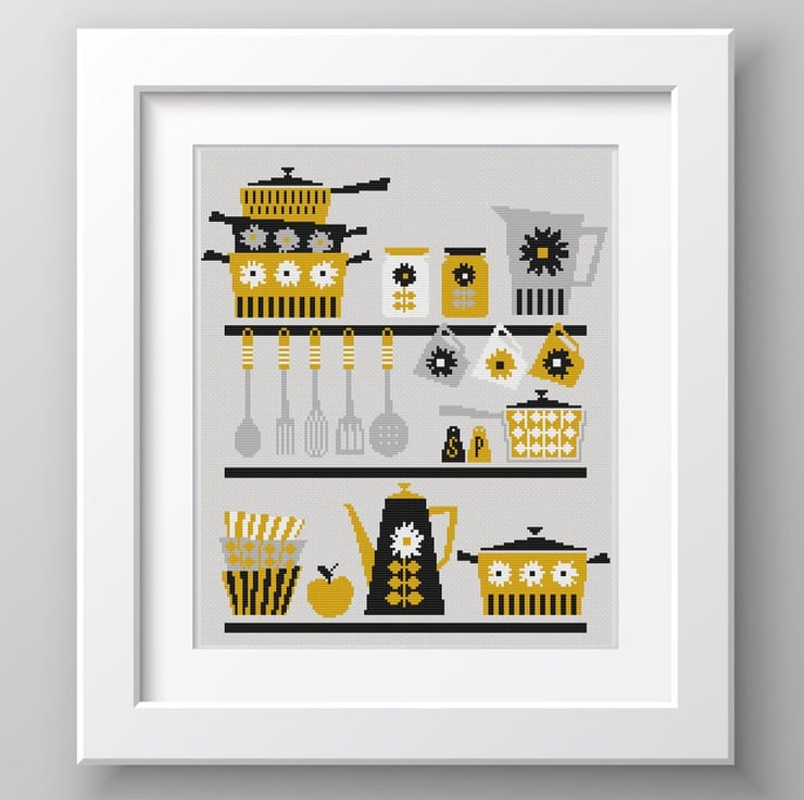 Cross stitch pattern 186A - Mid-Century retro 50's styled kitchen coffee pot, cups, pots and pans - Dark shades - quirky retro cross stitch/tapestry PDF chart by Vivsters. No delivery costs - PDF counted chart file straight to your inbox. Start stitching straight today!