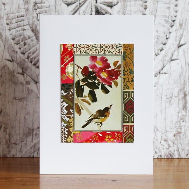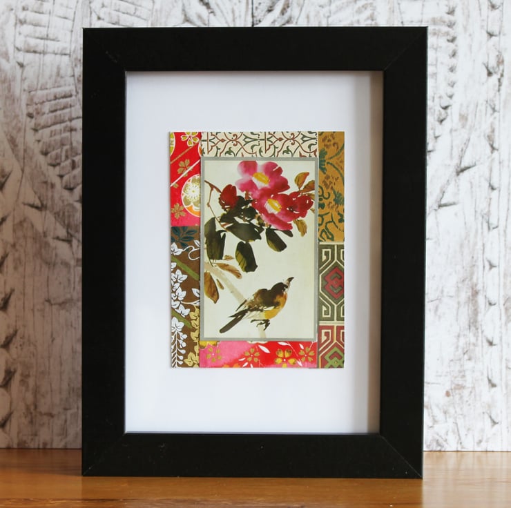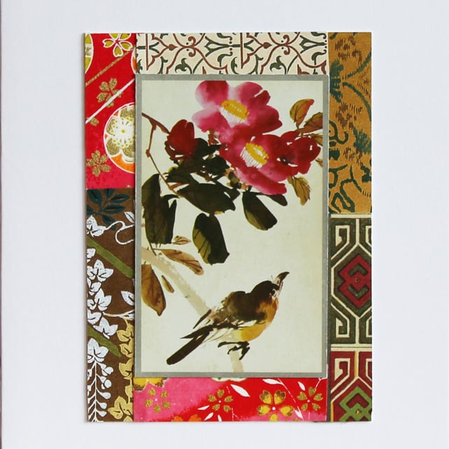 The collage has a pretty vintage playing card in the centre with a brush painting of a finch and blossom. I've used a selection of patterned papers from old books and Japanese origami papers to create a tapestry effect.