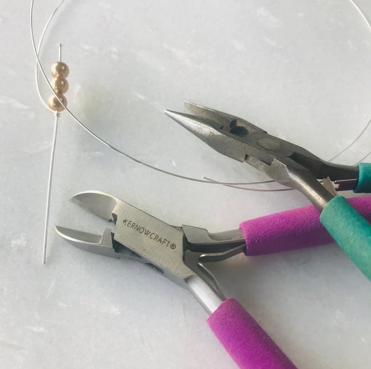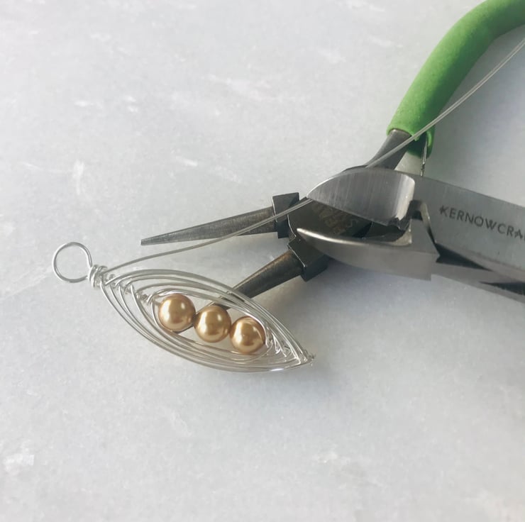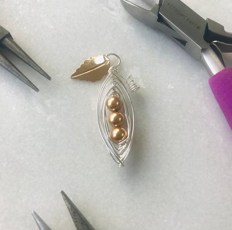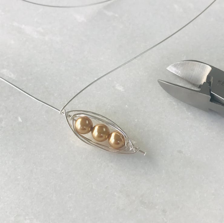 Handmade pea pod necklace wire wrapped with 3 gold Swarovski pearl beads.