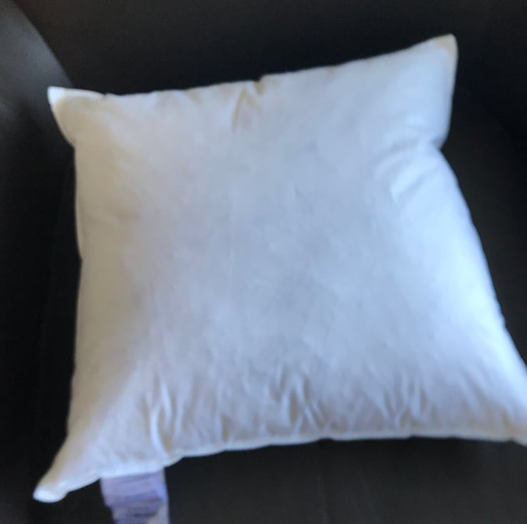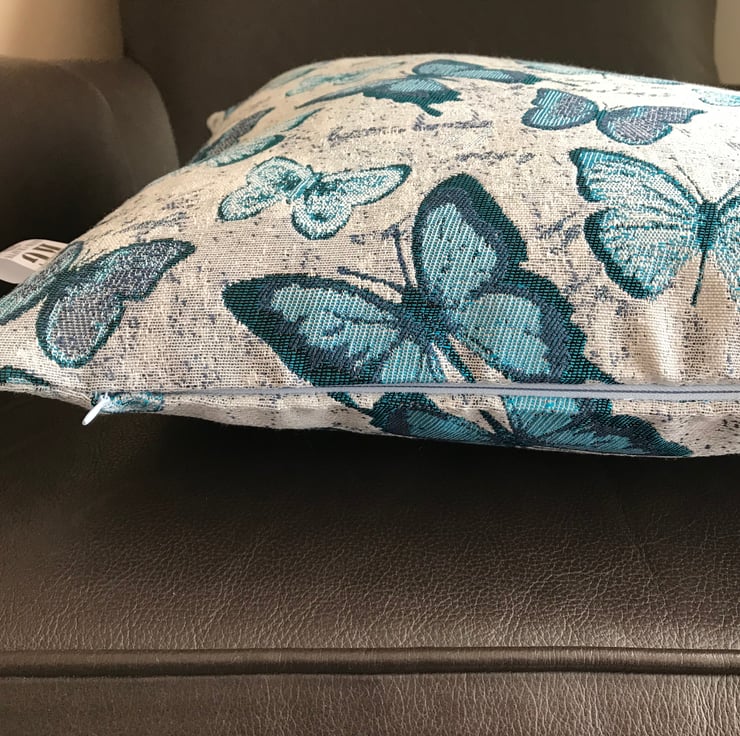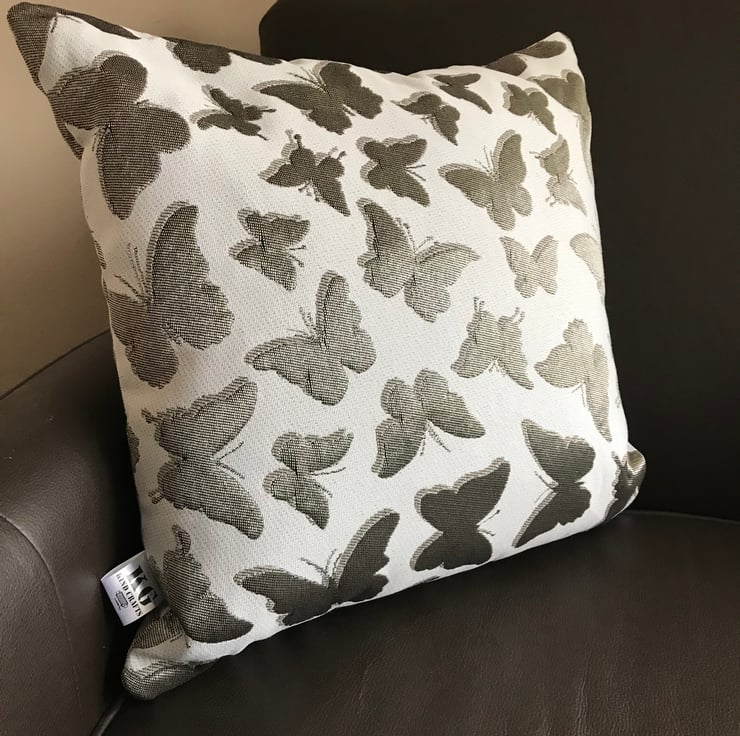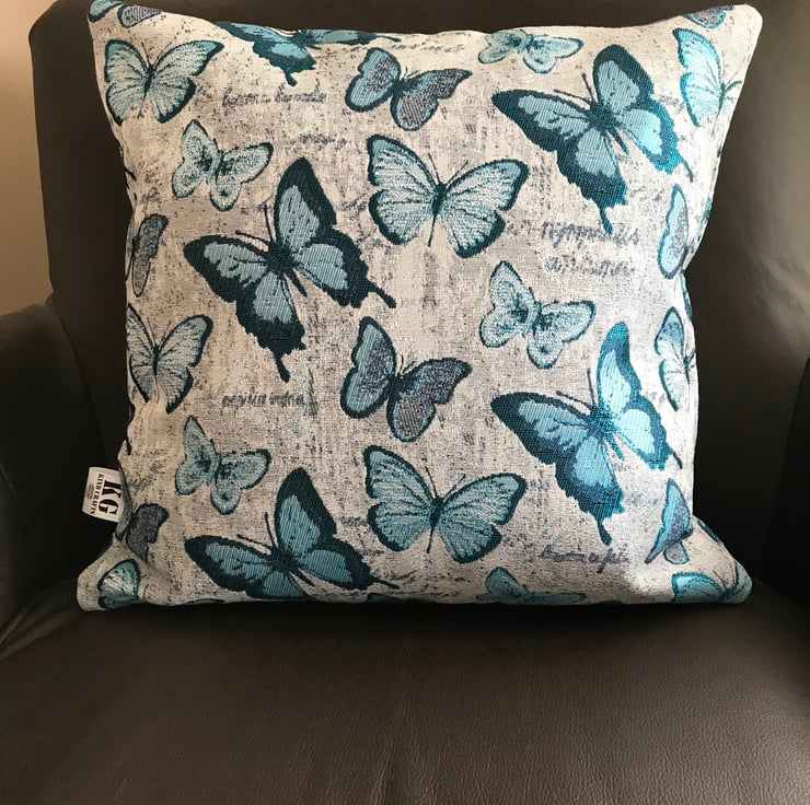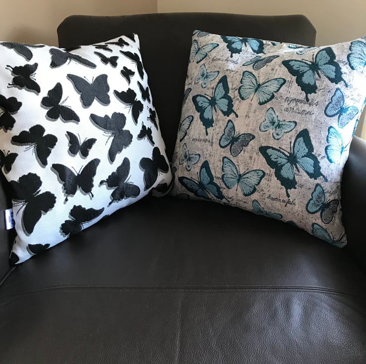 18in x 18in square cushion covers, with a duck feather pad in butterfly fabric.
