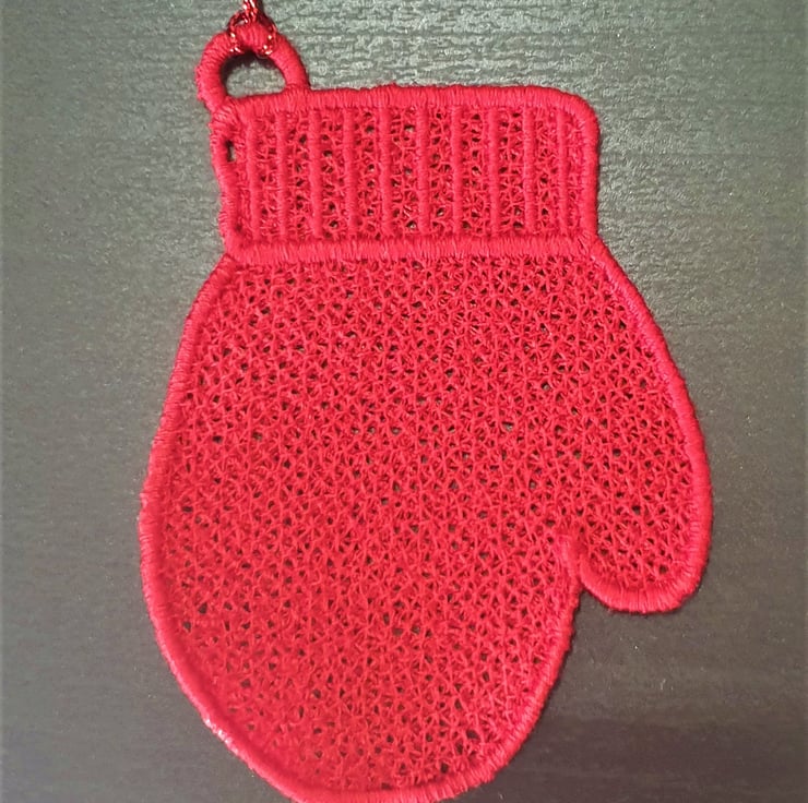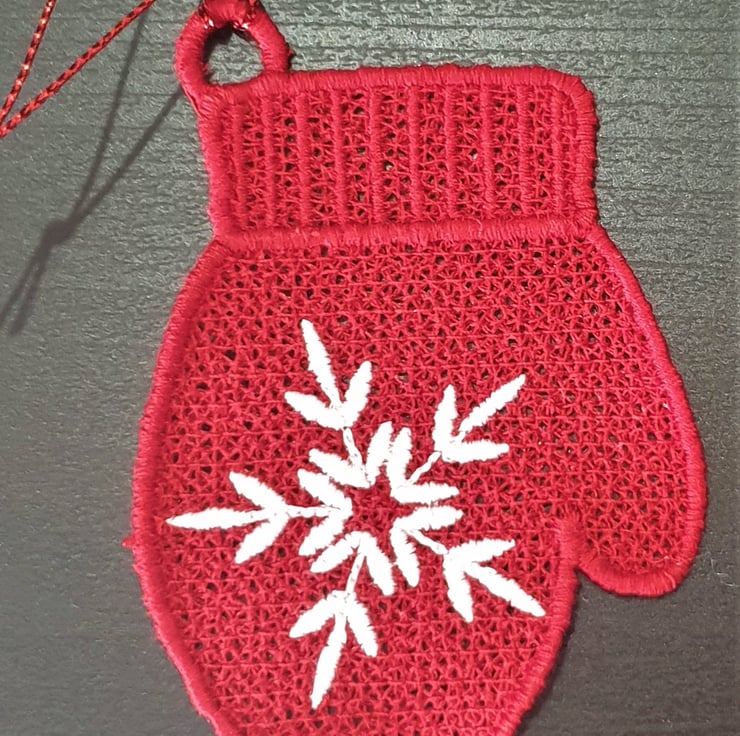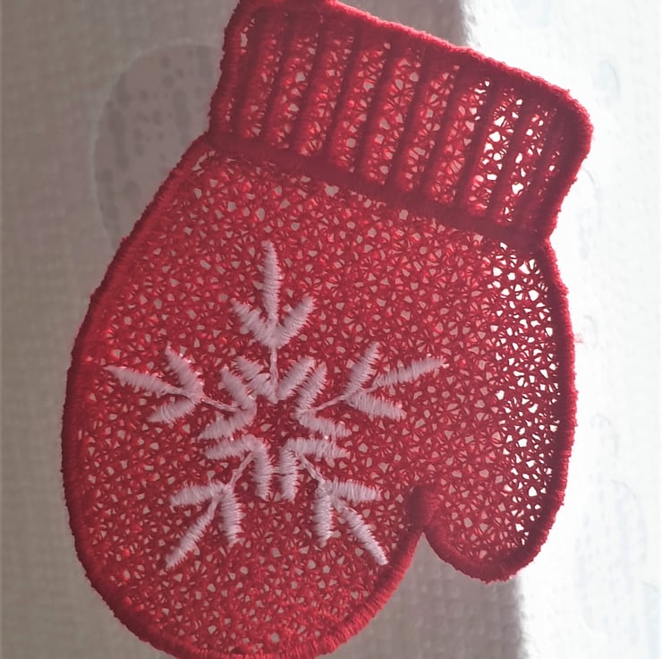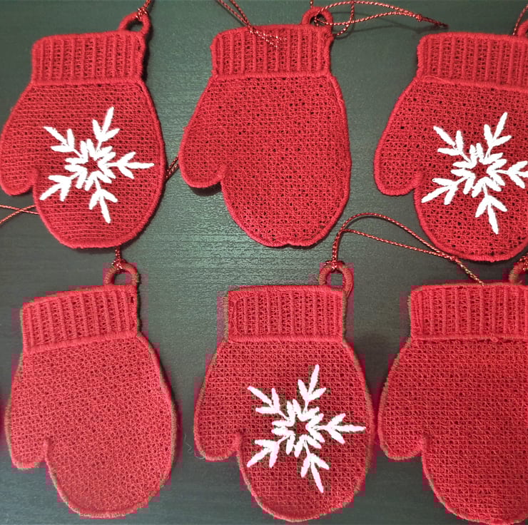 These cute mitten decorations have been embroidered using red thread. Some also have a white snowflake design, others are plain.