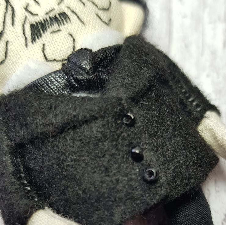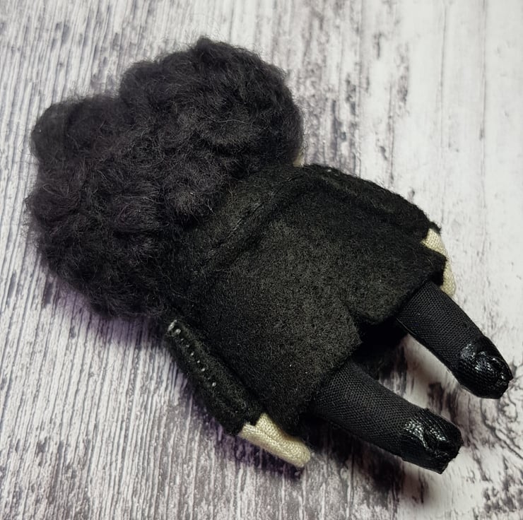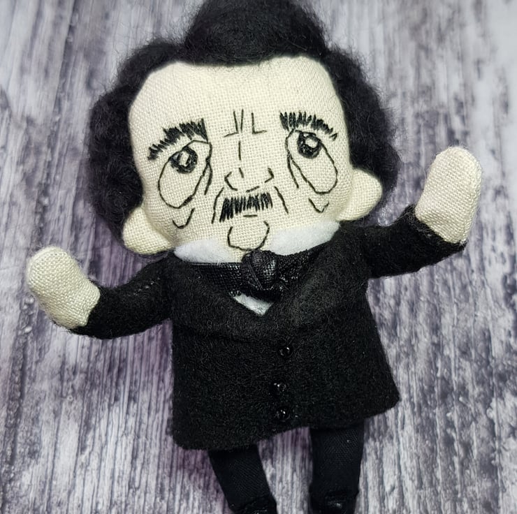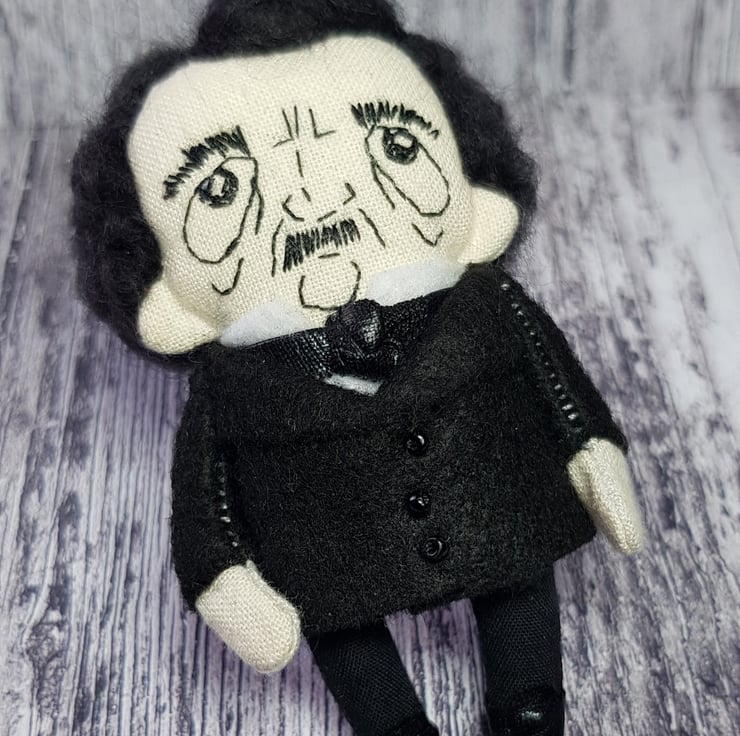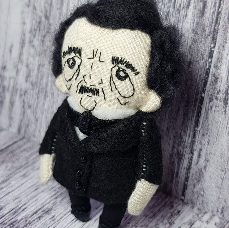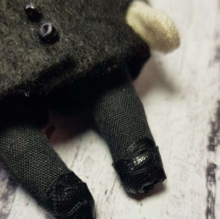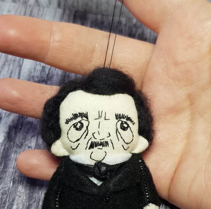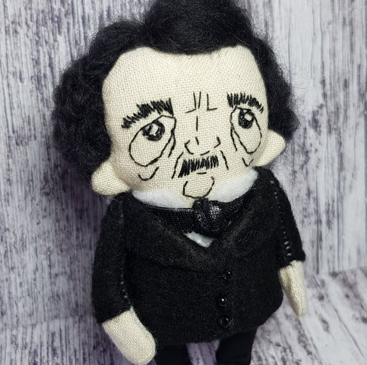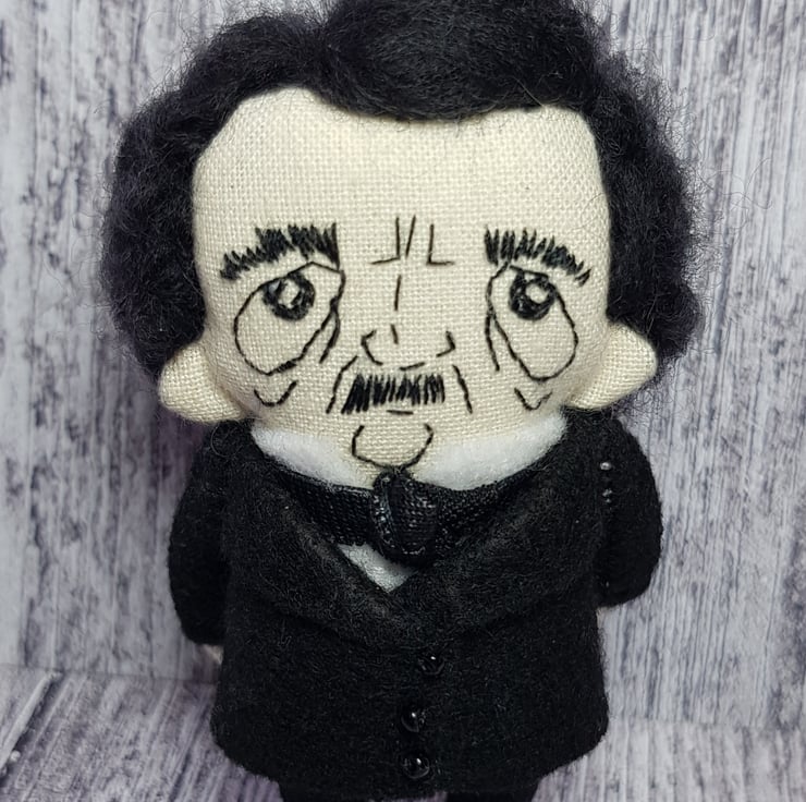 This somber little Edgar has hand embroidered face and hand dyed merino wool hair, needle felted into style. He wears a white felt shirt with shiny necktie and a felt jacket with beaded buttons. His clothes are sewn into place and not removable and he measures roughly just over 3 inches tall. This is for decorative purposes only and not a toy. Spot clean only. Sent in recyclable packaging.