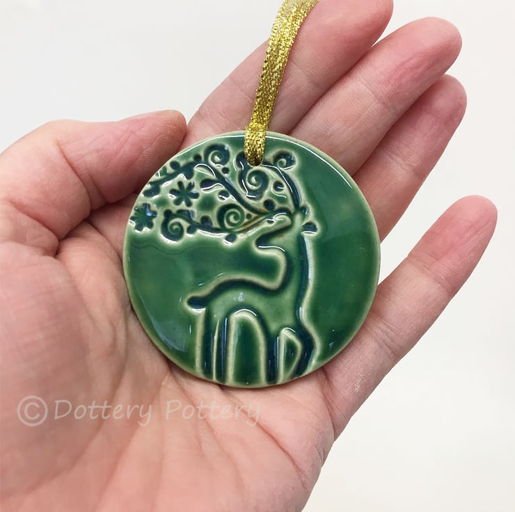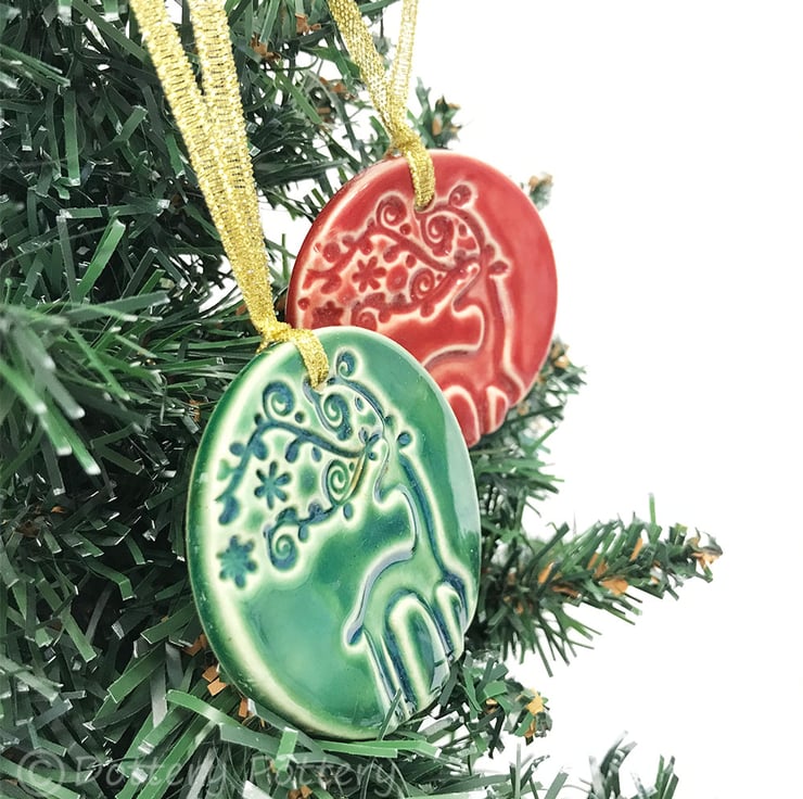 These cute little stag decorations are made from white earthenware clay, fired once, a rich glossy glaze is applied and it is then fired again - so is nice and strong. They measure 5cm x 5cm and hangs from a gold ribbon. Glazed on the front and left plain on the back.