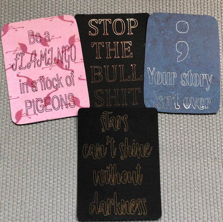 These are approximately 4x3 journal cards, with foiled quotes. The current designs are-