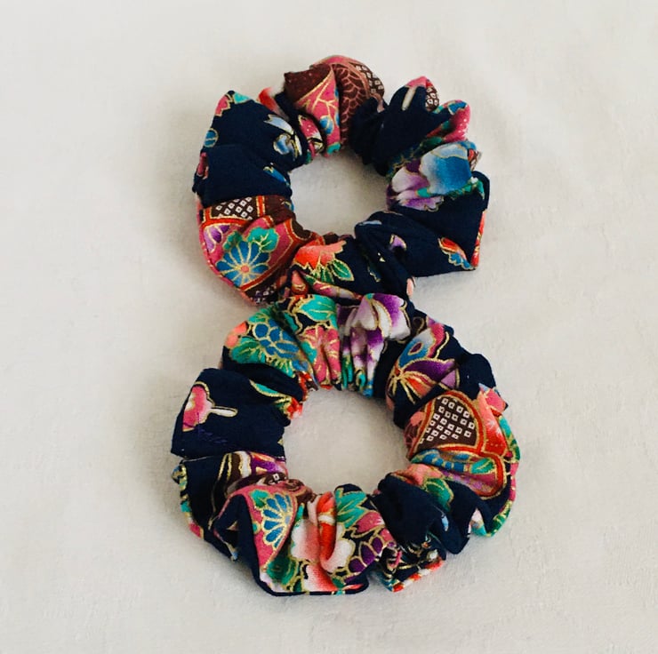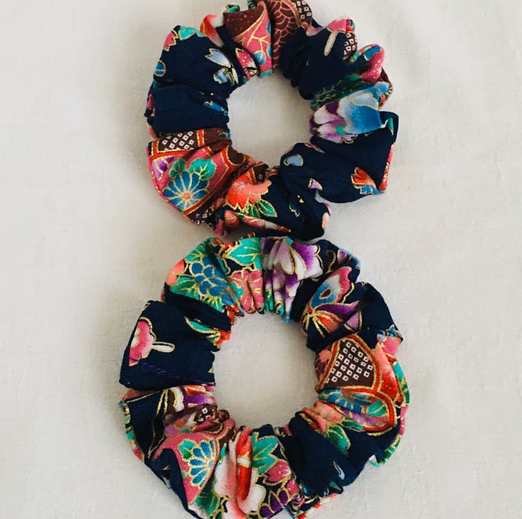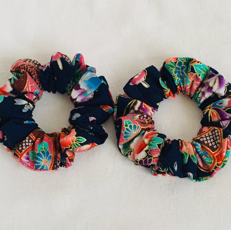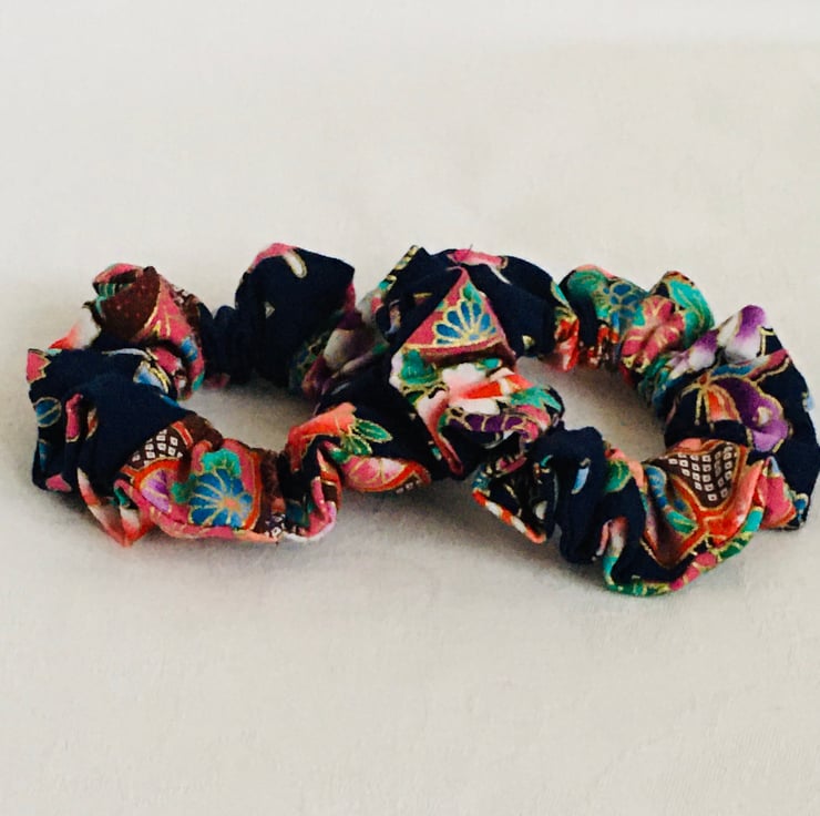 Why not adorn your hair with this set of on-trend beautiful set of scrunchies, to top off any bun or ponytail, to give hair envy and style your look. This set has been made using stunning quilting weight cotton fabric, in a Oriental design print that compliment each other. Great accessories for anyone's hair, to enhance even on a bad hair day.